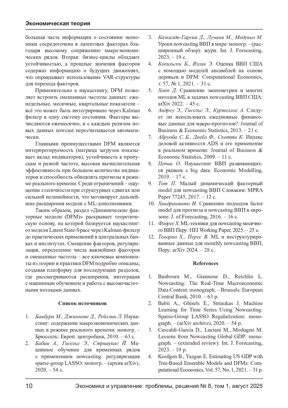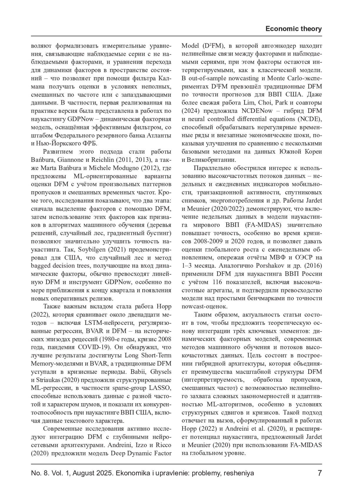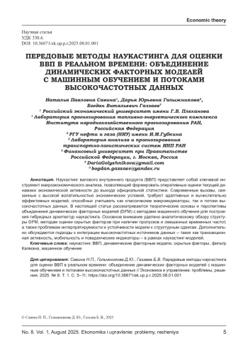 Наукастинг валового внутреннего продукта (ВВП) представляет собой ключевой инструмент макроэкономического анализа, позволяющий формировать оперативные оценки текущей динамики экономической активности до выхода официальной статистики. Современные вызовы, связанные с высокой волатильностью экономических условий, требуют адаптивных и вычислительно эффективных моделей, способных учитывать как классические макроиндикаторы, так и потоки высокочастотных данных. В настоящей статье рассматриваются теоретические основы и перспективы объединения динамических факторных моделей (DFM) с методами машинного обучения для построения гибридных архитектур наукастинга. Основное внимание уделено аналитическому обзору структуры DFM, методам оценки скрытых факторов при наличии пропусков и смешанных временных частот, а также проблемам интерпретируемости и устойчивости модели к структурным сдвигам. Дополнительно обсуждаются подходы к интеграции высокочастотных источников данных - таких как транзакционная активность, мобильность и поведенческие индикаторы - в рамках наукастинг-моделей.
