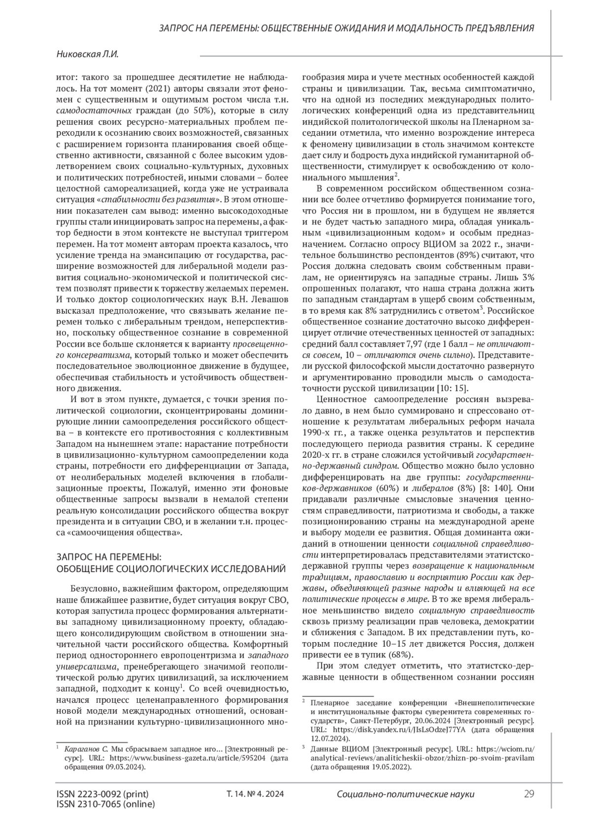 7. Петухов Р.В. Латов Ю,В. Что скрывается за запросом на перемены? // СОЦИС. Социальные исследования. 2022. № 2. С. 157-160. EDN: FWOAQQ