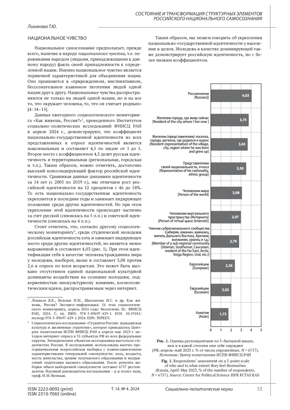 1. Бараш Р.Э. Национальное самосознание россиян после 2014 г. // Социологическая наука и социальная практика. 2018. Т. 6. № 4 (24). С. 7-18. EDN: YQJUFN