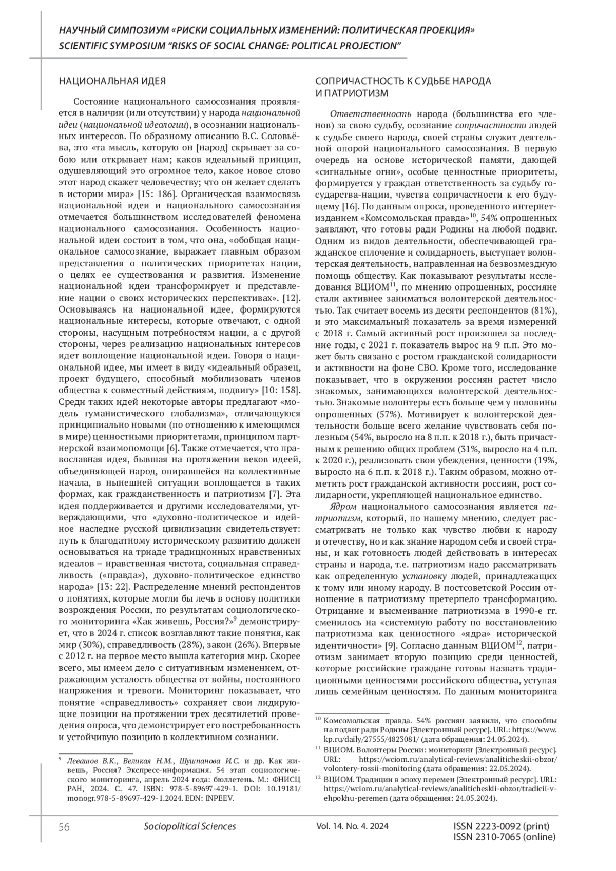 18. Шунина К.С. Русская идея как отражение русского национального самосознания // Сборник материалов Всероссийской науч. конф. молодых исследователей с международным участием “Социально-гуманитарные проблемы образования и профессиональной самореализации” (Социальный инженер-2022). Ч. 1. М.: РГУ им. А.Н. Косыгина, 2022. С. 248. EDN: KRXOEA