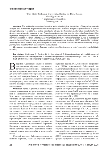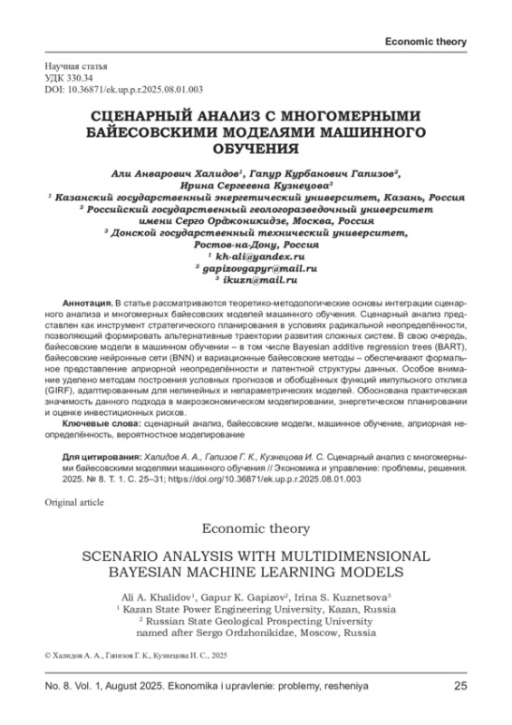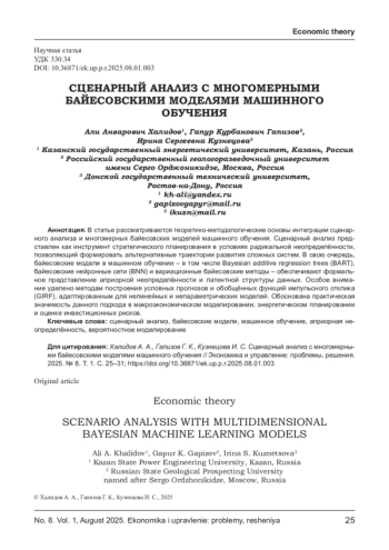 В статье рассматриваются теоретико-методологические основы интеграции сценарного анализа и многомерных байесовских моделей машинного обучения. Сценарный анализ представлен как инструмент стратегического планирования в условиях радикальной неопределённости, позволяющий формировать альтернативные траектории развития сложных систем. В свою очередь, байесовские модели в машинном обучении - в том числе Bayesian additive regression trees (BART), байесовские нейронные сети (BNN) и вариационные байесовские методы - обеспечивают формальное представление априорной неопределённости и латентной структуры данных. Особое внимание уделено методам построения условных прогнозов и обобщённых функций импульсного отклика (GIRF), адаптированным для нелинейных и непараметрических моделей. Обоснована практическая значимость данного подхода в макроэкономическом моделировании, энергетическом планировании и оценке инвестиционных рисков.