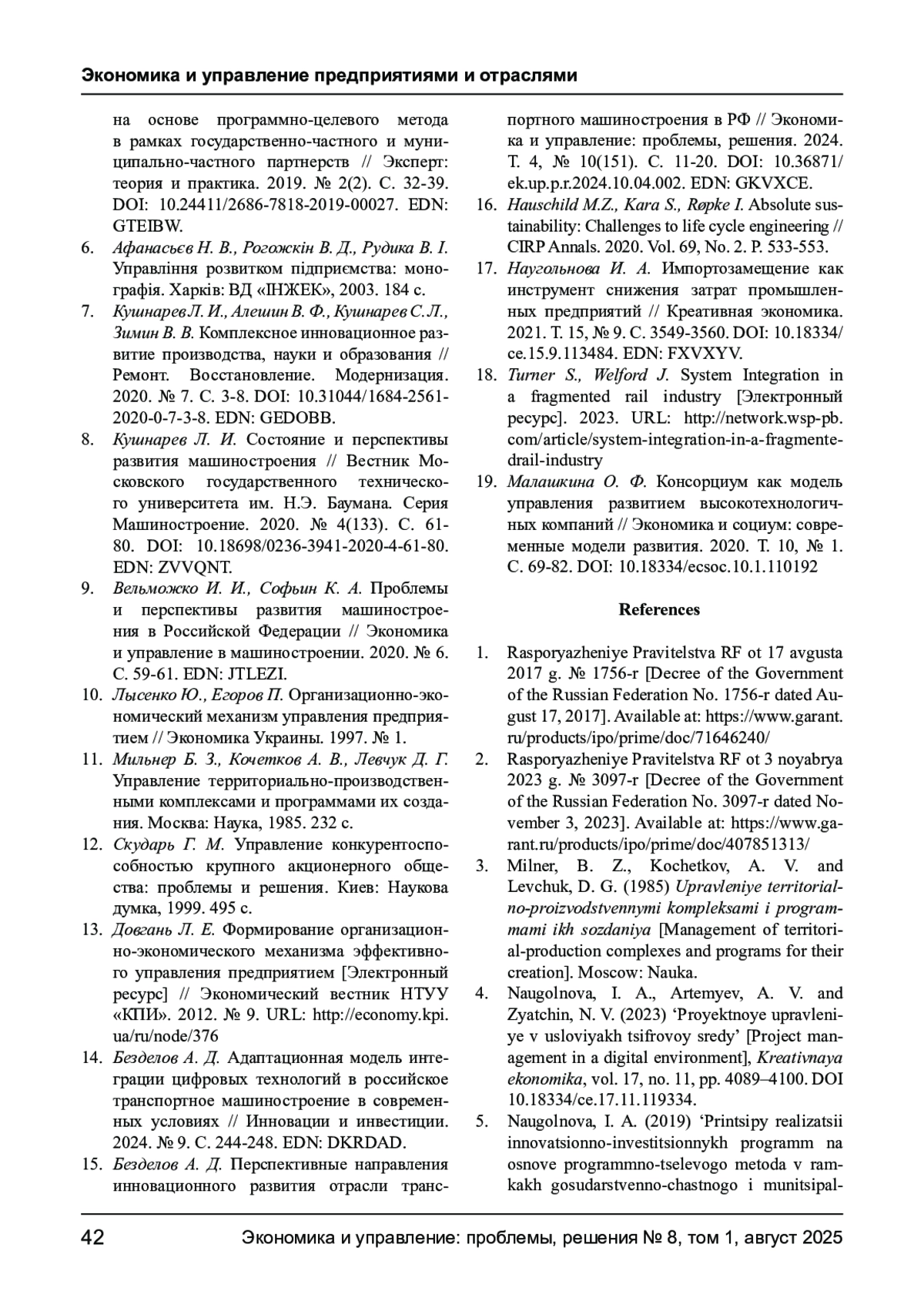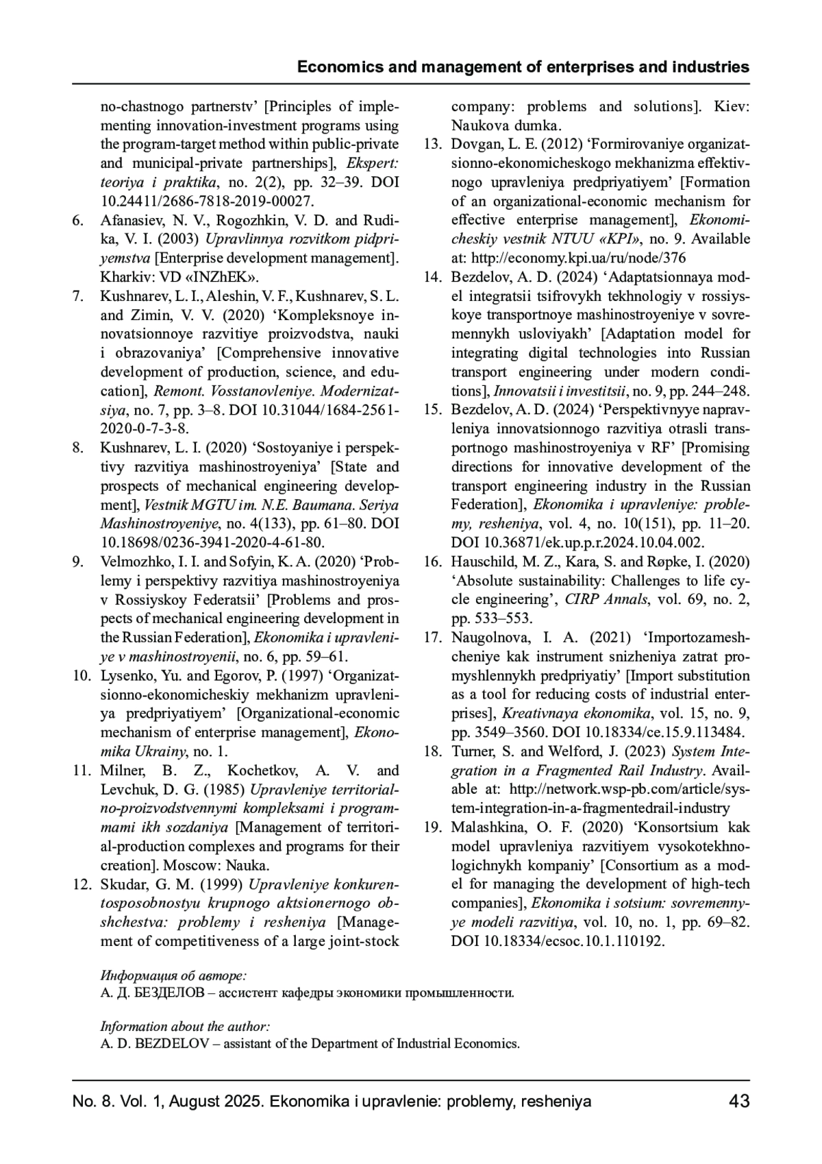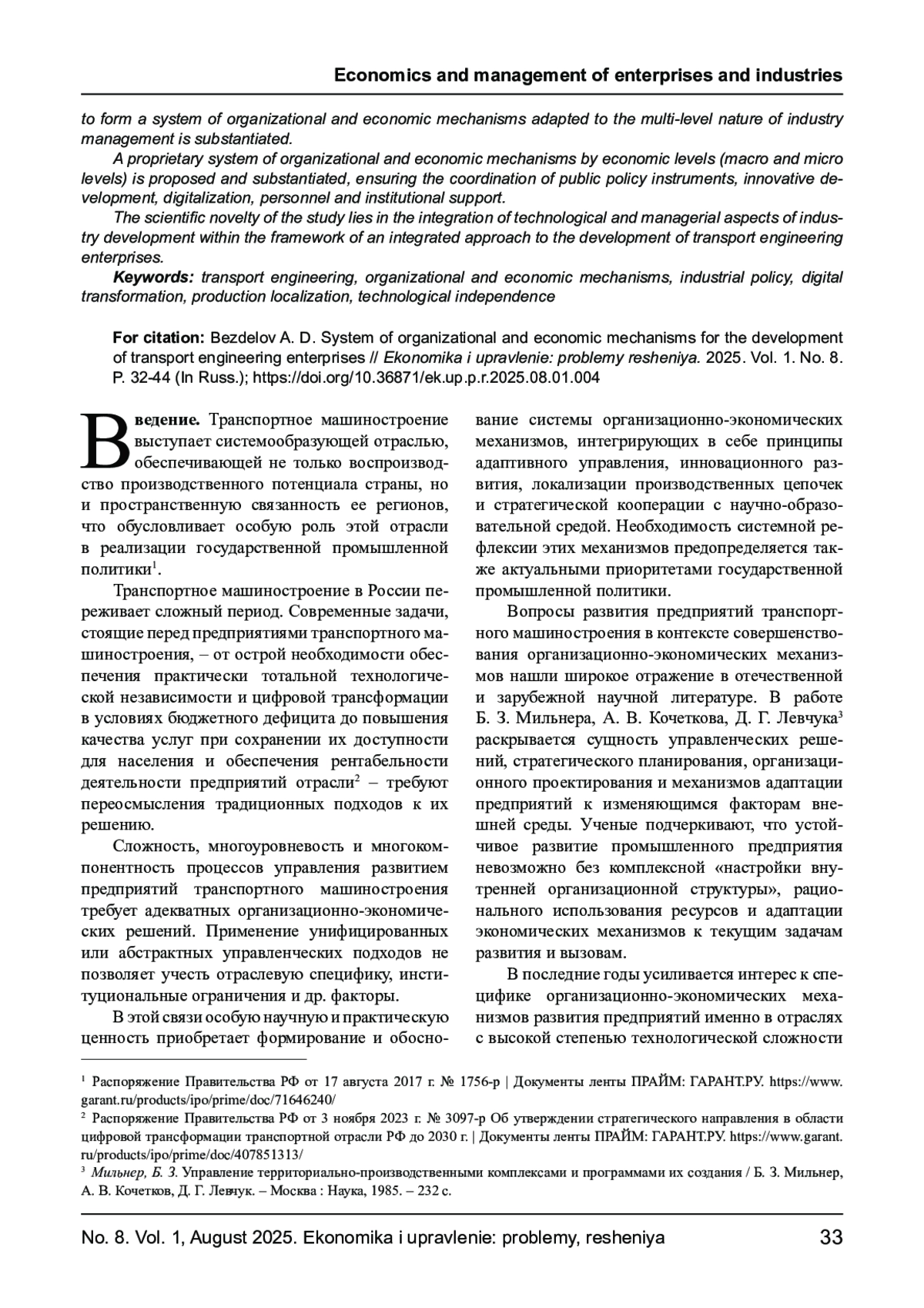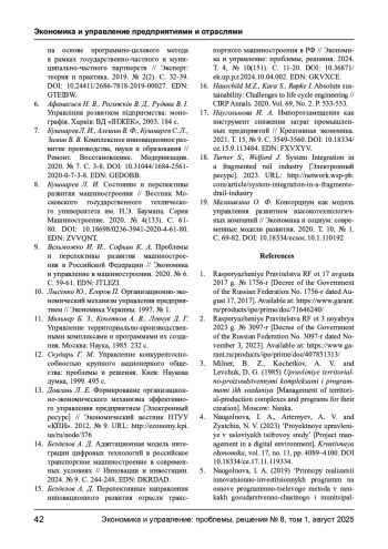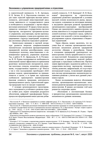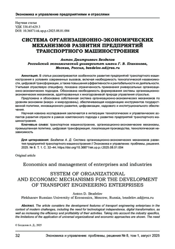 БЕЗДЕЛОВ А. Д. СИСТЕМА ОРГАНИЗАЦИОННО-ЭКОНОМИЧЕСКИХ МЕХАНИЗМОВ РАЗВИТИЯ ПРЕДПРИЯТИЙ ТРАНСПОРТНОГО МАШИНОСТРОЕНИЯ // ЭКОНОМИКА И УПРАВЛЕНИЕ: ПРОБЛЕМЫ, РЕШЕНИЯ. 2025. ТОМ 1 № 8