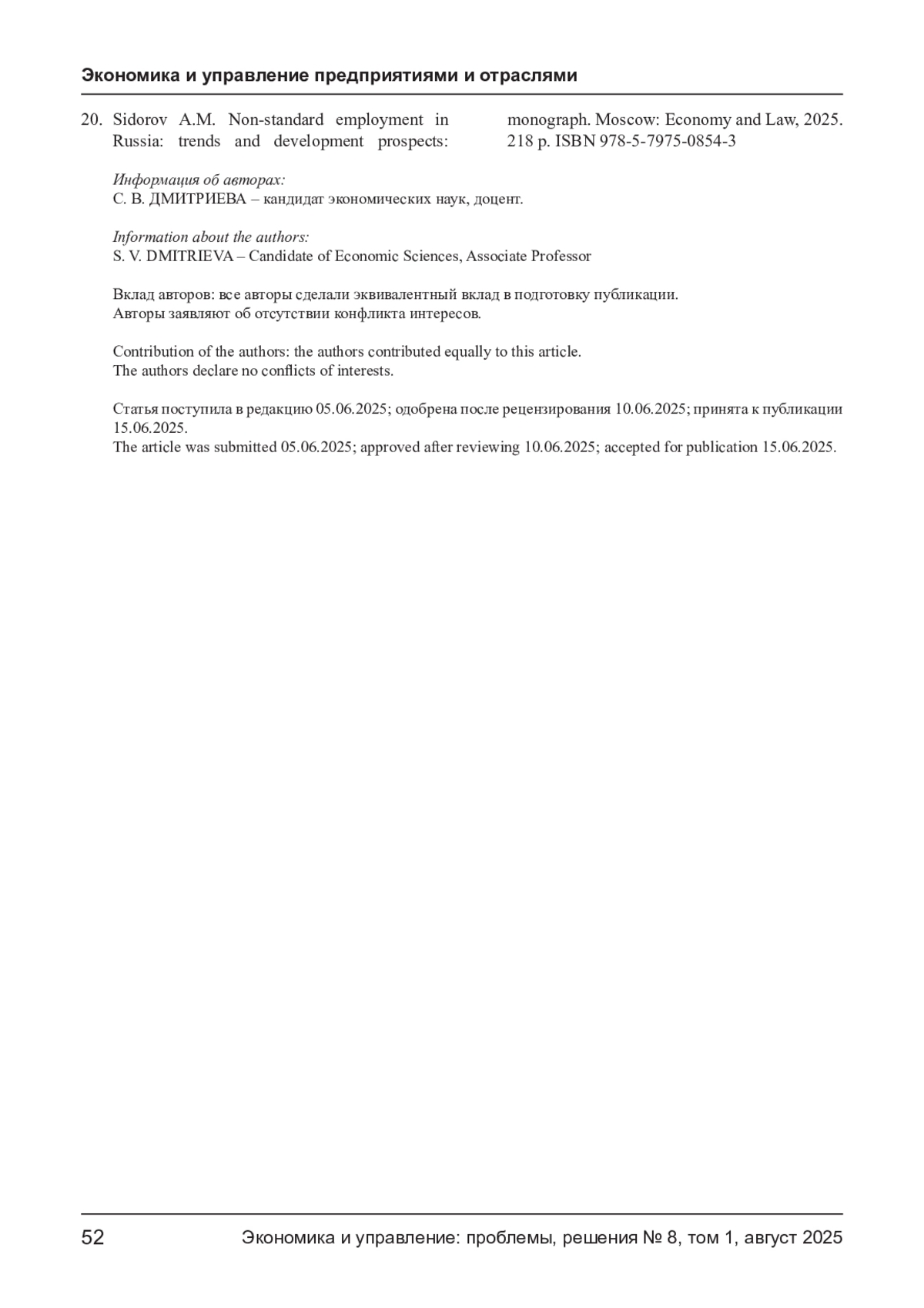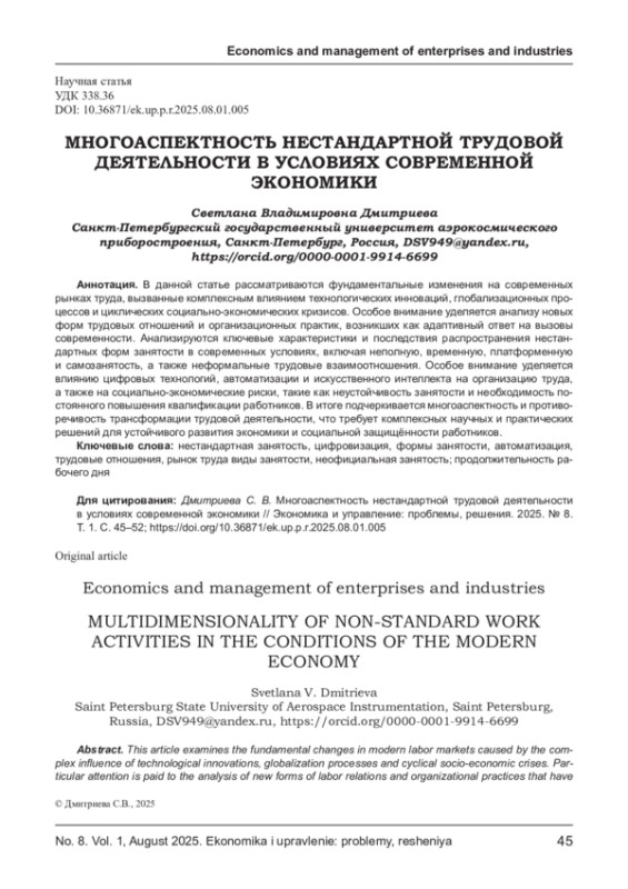 ДМИТРИЕВА С. В. МНОГОАСПЕКТНОСТЬ НЕСТАНДАРТНОЙ ТРУДОВОЙ ДЕЯТЕЛЬНОСТИ В УСЛОВИЯХ СОВРЕМЕННОЙ ЭКОНОМИКИ // ЭКОНОМИКА И УПРАВЛЕНИЕ: ПРОБЛЕМЫ, РЕШЕНИЯ. 2025. ТОМ 1 № 8