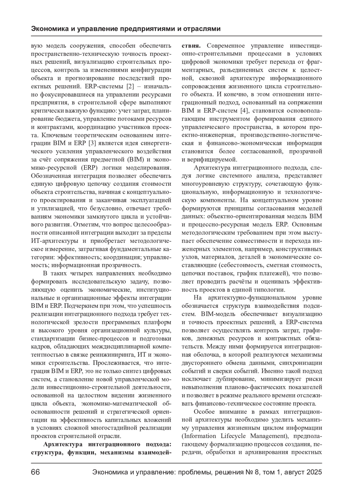 5. Баранов П. В., Иванова Е. С. Цифровая трансформация в строительной отрасли: интеграция BIM и ERP-систем // Вестник строительной экономики. 2022. Т. 12, № 3. С. 45-56.