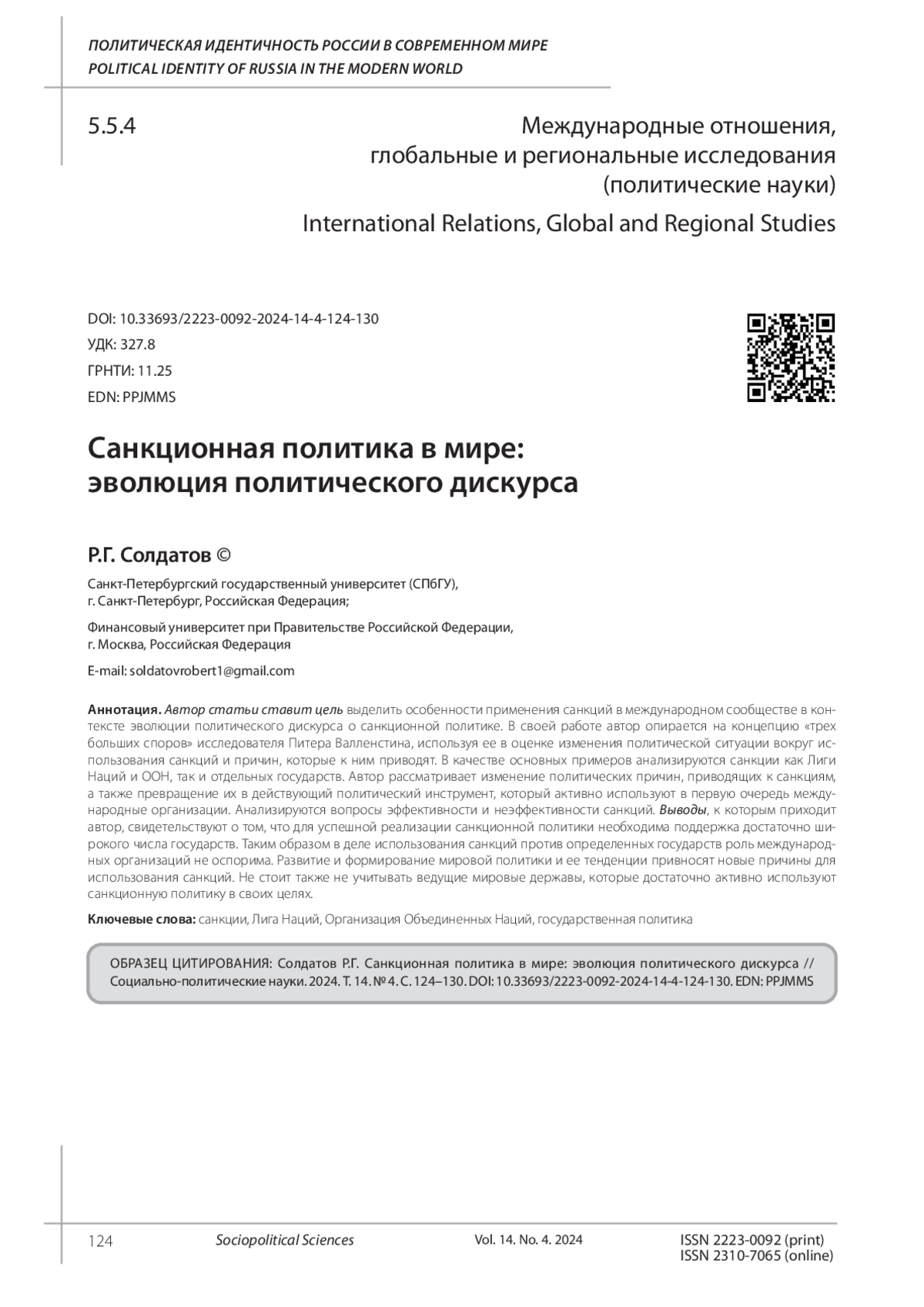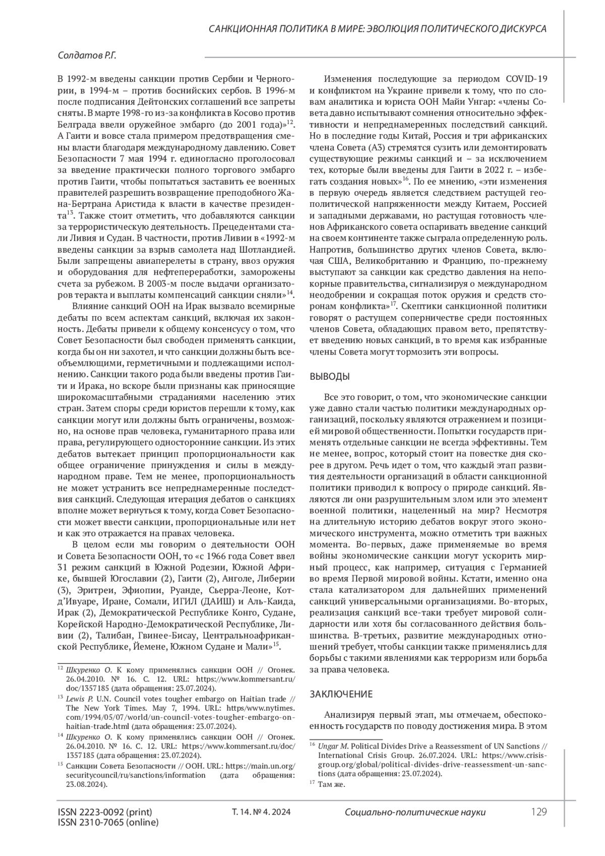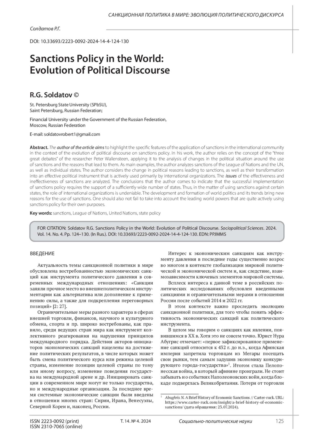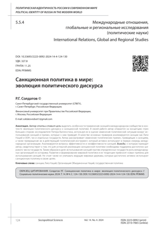 СОЛДАТОВ Р. Г. САНКЦИОННАЯ ПОЛИТИКА В МИРЕ: ЭВОЛЮЦИЯ ПОЛИТИЧЕСКОГО ДИСКУРСА // СОЦИАЛЬНО-ПОЛИТИЧЕСКИЕ НАУКИ. 2024. Т. 14 № 4