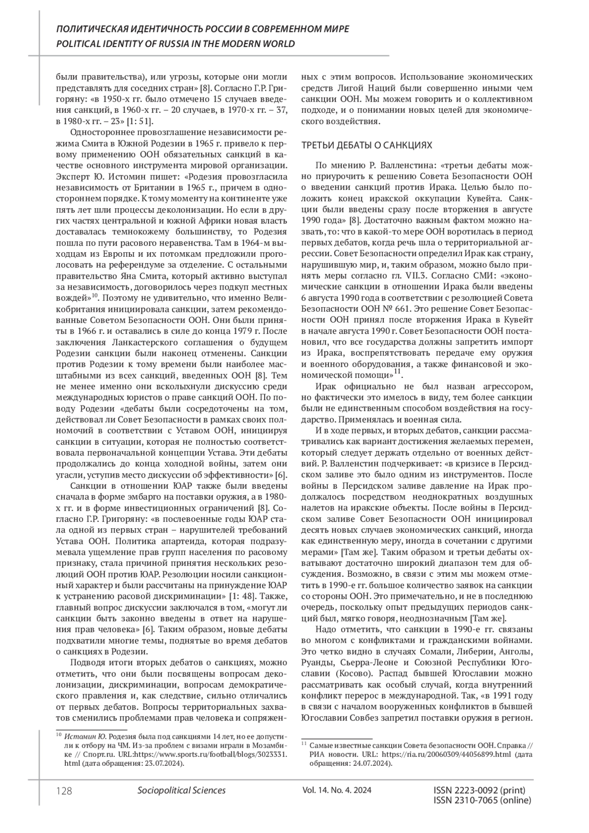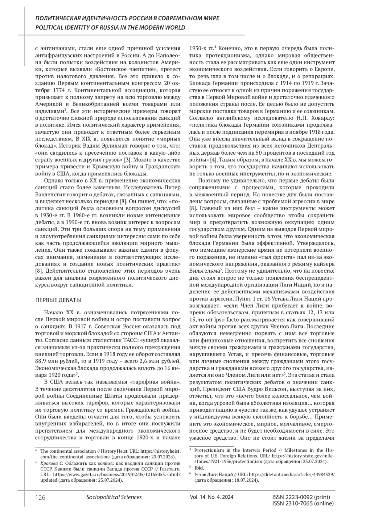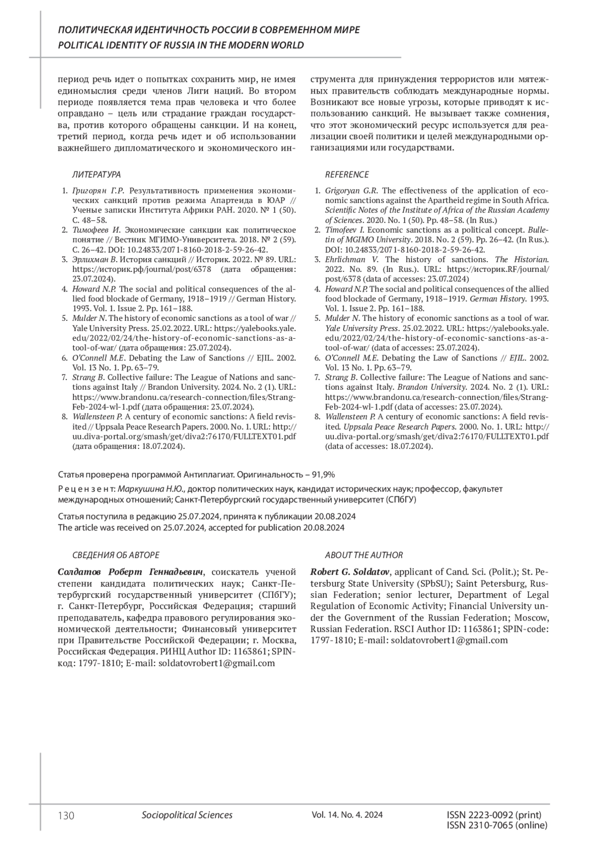 СОЛДАТОВ Р. Г. САНКЦИОННАЯ ПОЛИТИКА В МИРЕ: ЭВОЛЮЦИЯ ПОЛИТИЧЕСКОГО ДИСКУРСА // СОЦИАЛЬНО-ПОЛИТИЧЕСКИЕ НАУКИ. 2024. Т. 14 № 4