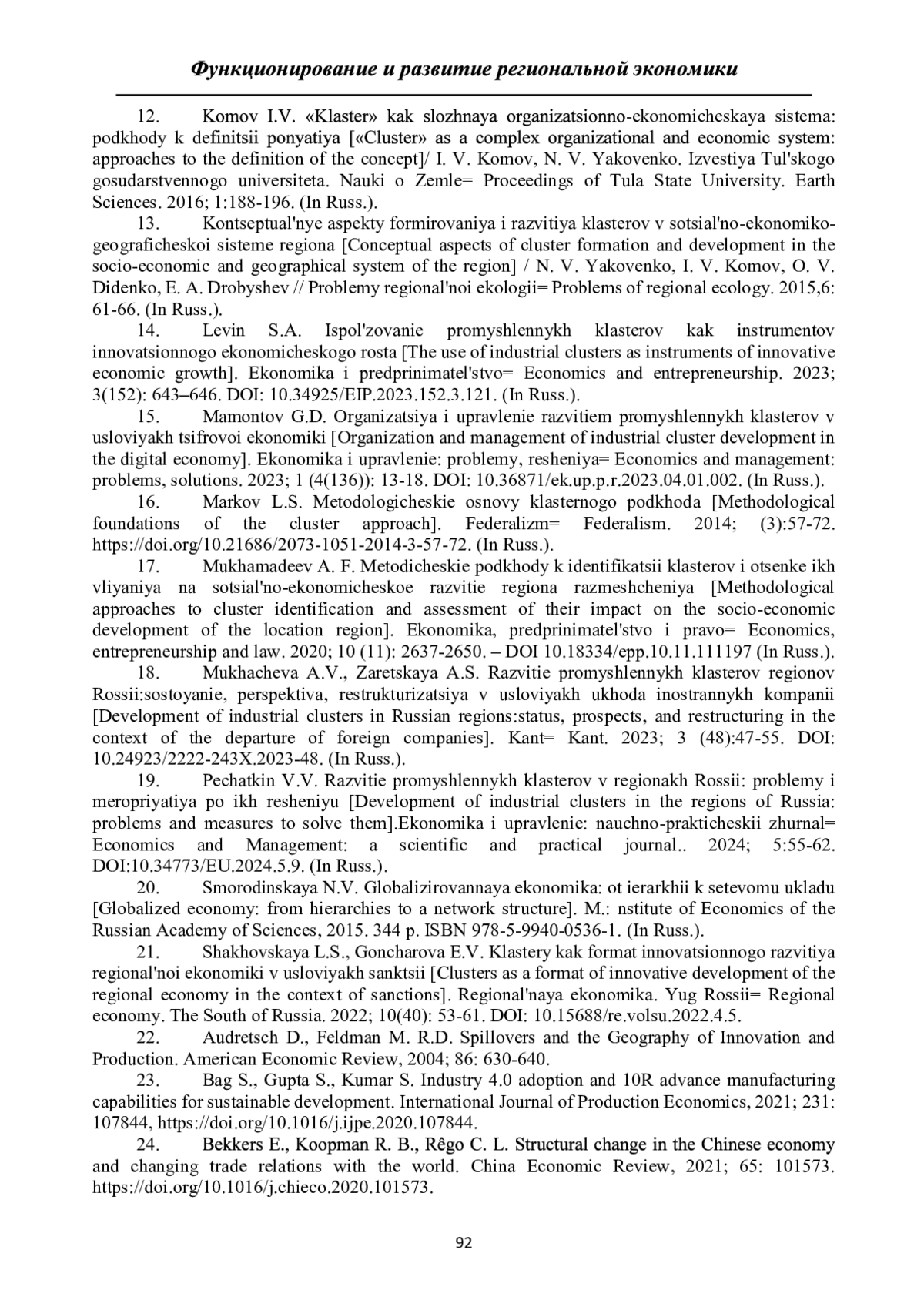 19. Печаткин В.В. Развитие промышленных кластеров в регионах России: проблемы и мероприятия по их решению // Экономика и управление: научно-практический журнал. 2024; 5: 55-62. DOI: 10.34773/EU.2024.5.9 EDN: ELYJBP