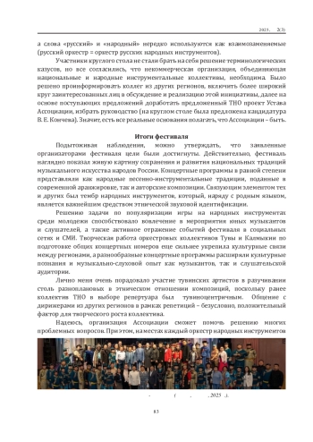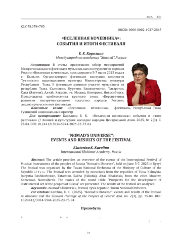 В статье представлен обзор мероприятий Межрегионального фестиваля музыкальных инструментов народов России «Вселенная кочевника», проходившего 5-7 июня 2025 года в г. Кызыле. Организатором фестиваля выступил коллектив Тувинского национального оркестра Министерства культуры Республики Тыва. В фестивале приняли участие музыканты из республик Тыва, Калмыкия, Бурятия, Башкортостан, Татарстан, Саха (Якутия), Алтай, Хакасия, гг. Москва, Кемерово, Новосибирск. Представлена проблематика круглого стола «Перспективы развития инструментального искусства народов России», анализируются итоги фестиваля.