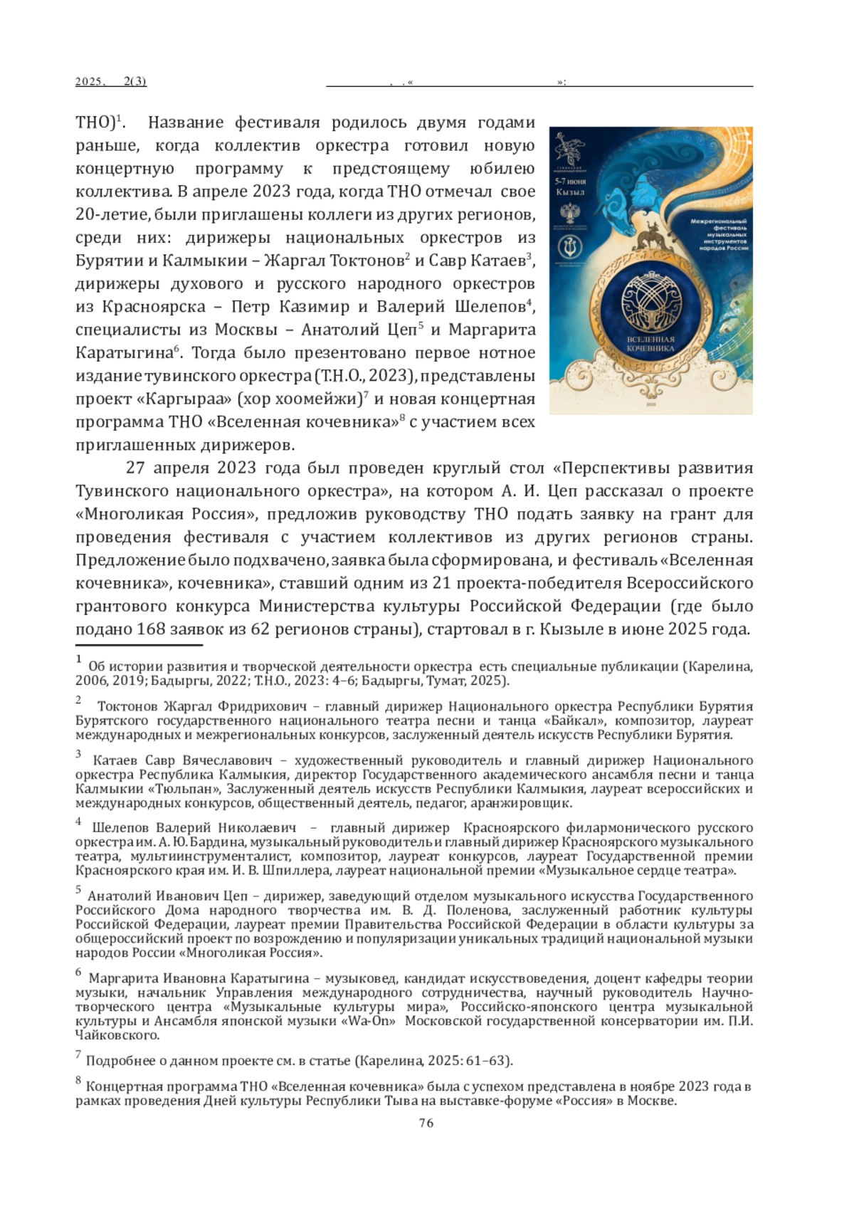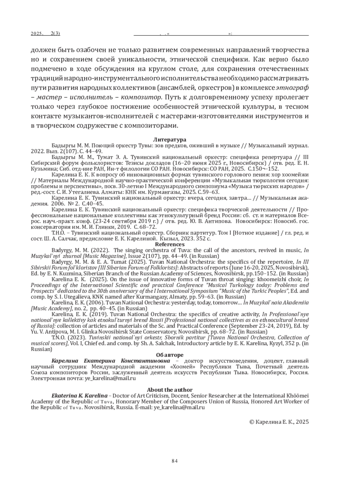 5. Карелина Е. К. Тувинский национальный оркестр: специфика творческой деятельности // Профессиональные национальные коллективы как этнокультурный бренд России: сб. ст. и материалов Всерос. науч.-практ. конф. (23-24 сентября 2019 г.) / отв. ред. Ю. В. Антипова. Новосибирск: Новосиб. гос.консерватория им. М. И. Глинки, 2019. С. 68-72. EDN: YTHOSM