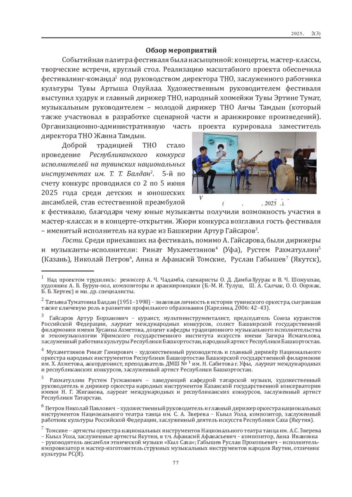2. Бадыргы М. М., Тумат Э. А. Тувинский национальный оркестр: специфика репертуара // III Сибирский форум фольклористов: Тезисы докладов (16-20 июня 2025 г., Новосибирск) / отв. ред. Е. Н. Кузьмина; Сиб. отд-ние РАН, Ин-т филологии СО РАН. Новосибирск: СО РАН, 2025. С.150-152.