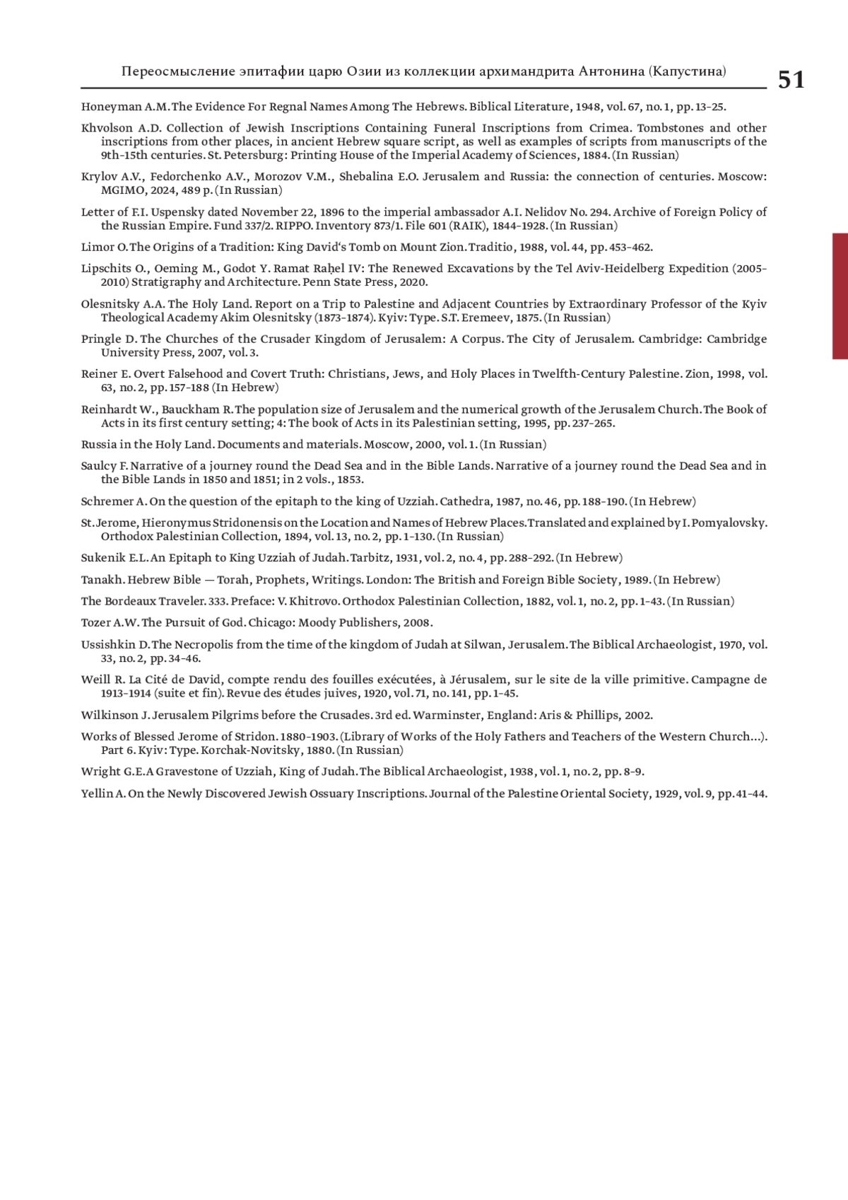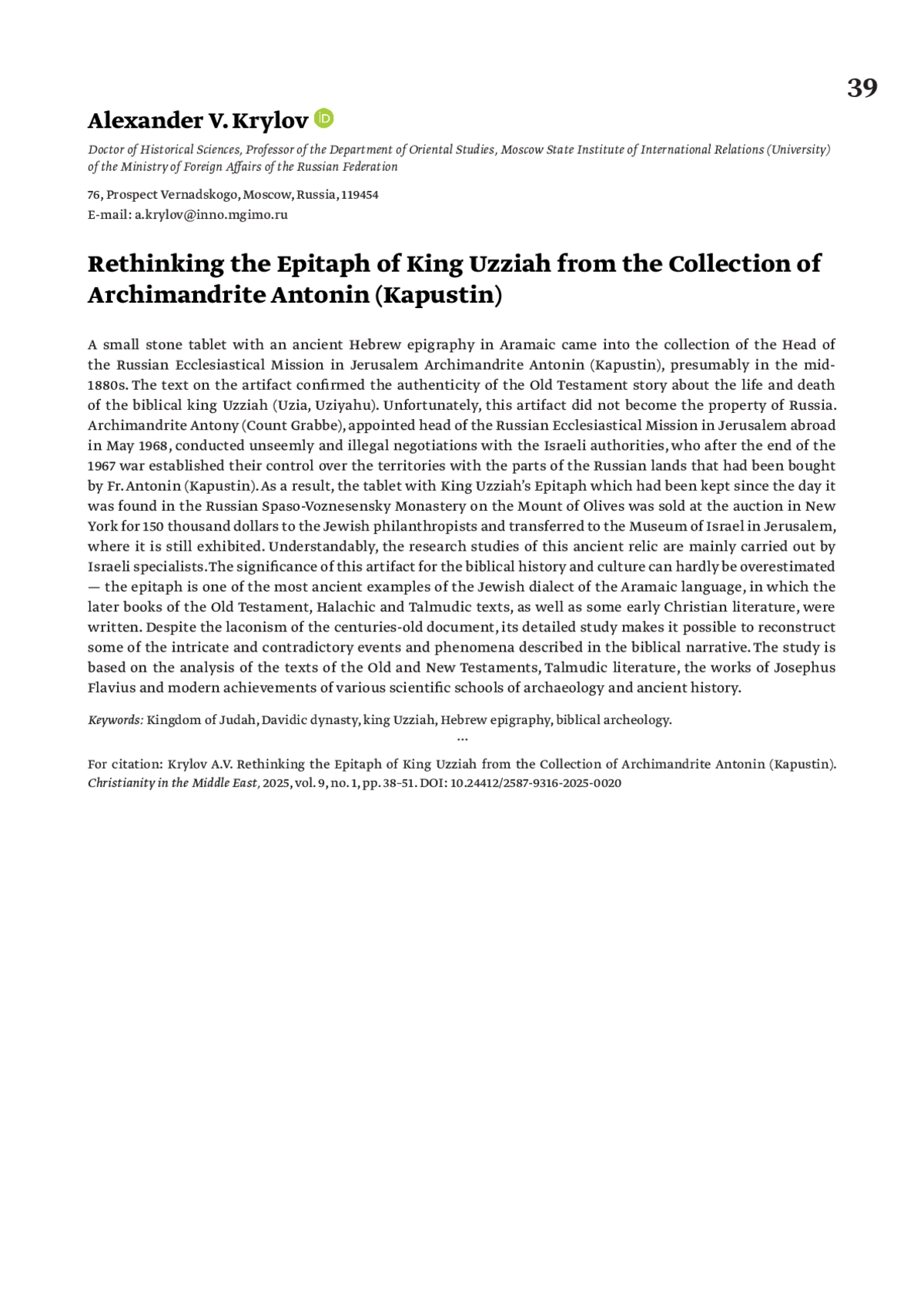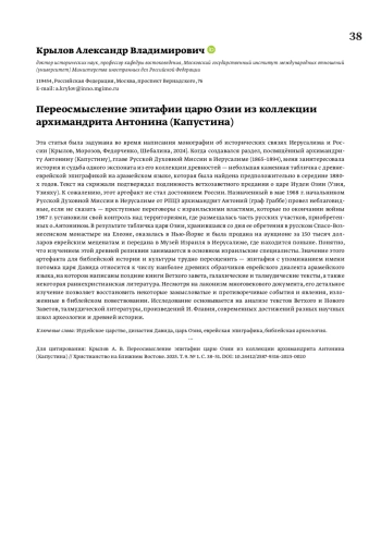 КРЫЛОВ А. В. ПЕРЕОСМЫСЛЕНИЕ ЭПИТАФИИ ЦАРЮ ОЗИИ ИЗ КОЛЛЕКЦИИ АРХИМАНДРИТА АНТОНИНА (КАПУСТИНА) // ХРИСТИАНСТВО НА БЛИЖНЕМ ВОСТОКЕ. 2025. № 1, ТОМ 9