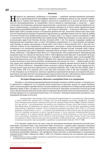Эта статья была задумана во время написания монографии об исторических связях Иерусалима и России [Крылов, Морозов, Федорченко, Шебалина, 2024]. Когда создавался раздел, посвящённый архимандриту Антонину (Капустину), главе Русской Духовной Миссии в Иерусалиме (1865–1894), меня заинтересовала история и судьба одного экспоната из его коллекции древностей — небольшая каменная табличка с древнееврейской эпиграфикой на арамейском языке, которая была найдена предположительно в середине 1880- х годов. Текст на скрижали подтверждал подлинность ветхозаветного предания о царе Иудеи Озии (Узия, Узияху). К сожалению, этот артефакт не стал достоянием России. Назначенный в мае 1968 г. начальником Русской Духовной Миссии в Иерусалиме от РПЦЗ архимандрит Антоний (граф Граббе) провел неблаговидные, если не сказать — преступные переговоры с израильскими властями, которые по окончании войны 1967 г. установили свой контроль над территориями, где размещалась часть русских участков, приобретенных о. Антонином. В результате табличка царя Озии, хранившаяся со дня ее обретения в русском Спасо-Вознесенском монастыре на Елеоне, оказалась в Нью-Йорке и была продана на аукционе за 150 тысяч долларов еврейским меценатам и передана в Музей Израиля в Иерусалиме, где находится поныне. Понятно, что изучением этой древней реликвии занимаются в основном израильские специалисты. Значение этого артефакта для библейской истории и культуры трудно переоценить — эпитафия с упоминанием имени потомка царя Давида относится к числу наиболее древних образчиков еврейского диалекта арамейского языка, на котором написаны поздние книги Ветхого завета, галахические и талмудические тексты, а также некоторая раннехристианская литература. Несмотря на лаконизм многовекового документа, его детальное изучение позволяет восстановить некоторые замысловатые и противоречивые события и явления, изложенные в библейском повествовании. Исследование основывается на анализе текстов Ветхого и Нового Заветов, талмудической литературы, произведений И. Флавия, современных достижений разных научных школ археологии и древней истории.