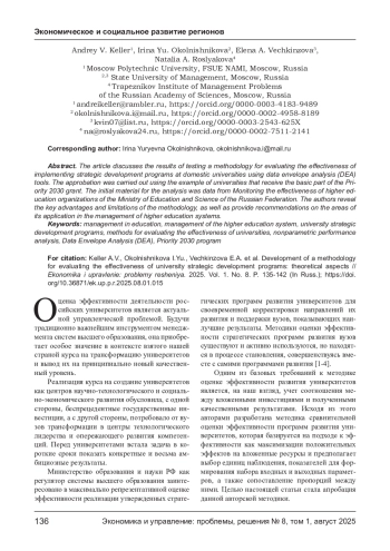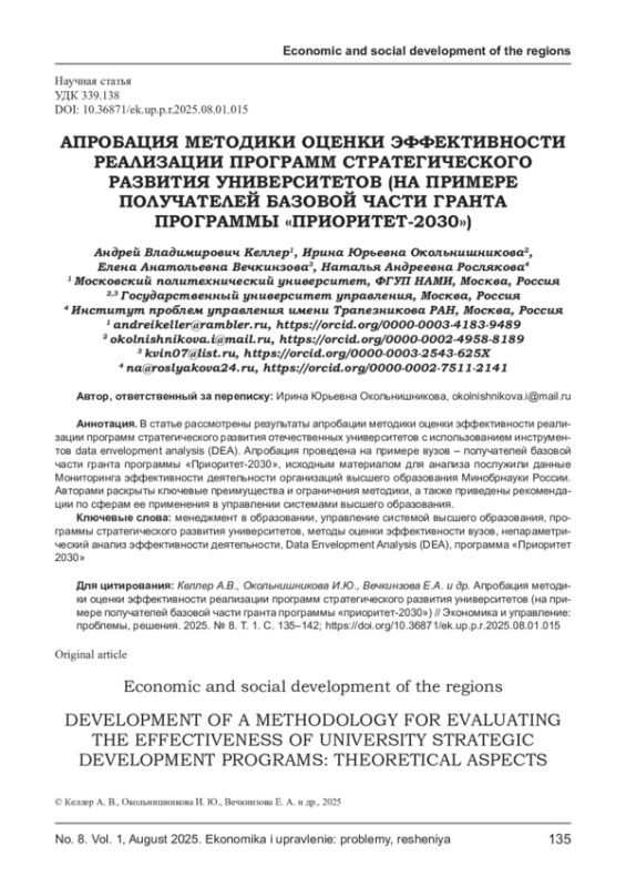 В статье рассмотрены результаты апробации методики оценки эффективности реализации программ стратегического развития отечественных университетов с использованием инструментов data envelopment analysis (DEA). Апробация проведена на примере вузов - получателей базовой части гранта программы «Приоритет-2030», исходным материалом для анализа послужили данные Мониторинга эффективности деятельности организаций высшего образования Минобрнауки России. Авторами раскрыты ключевые преимущества и ограничения методики, а также приведены рекомендации по сферам ее применения в управлении системами высшего образования.