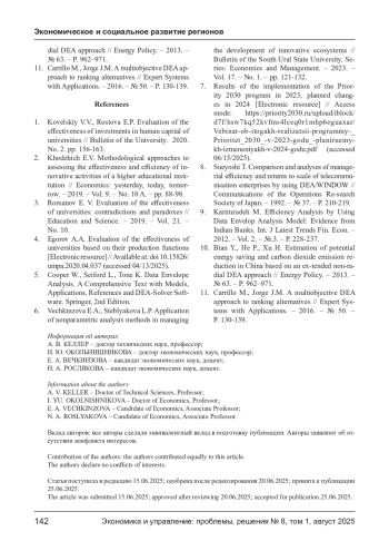 4. Егоров А.А. Оценка эффективности деятельности университетов на основе их производственных функций [Электронный ресурс] // Режим доступа: 10.15826/umpa.2020.04.037 (дата обращения 13.04.2025 г.). DOI: 10.15826/umpa.2020.04.037(