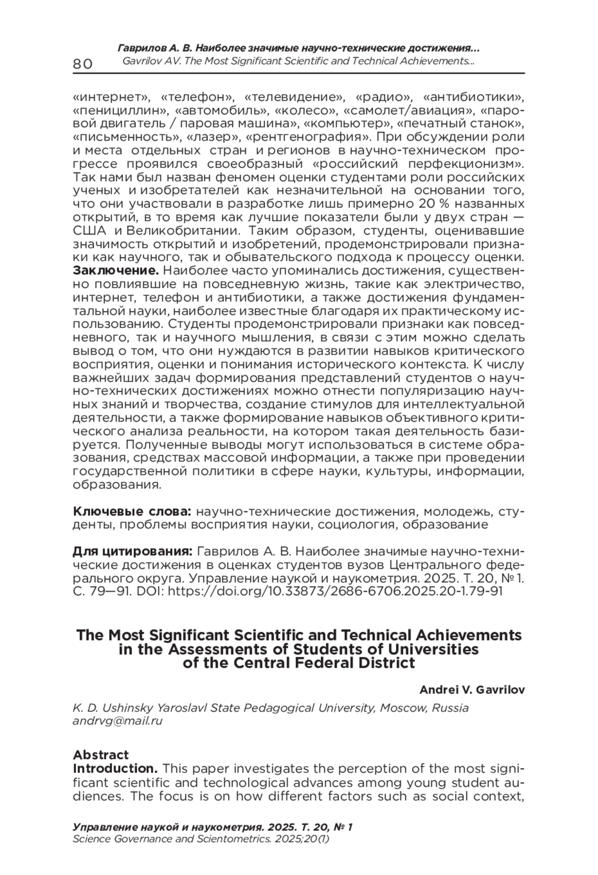 ГАВРИЛОВ А. В. НАИБОЛЕЕ ЗНАЧИМЫЕ НАУЧНО-ТЕХНИЧЕСКИЕ ДОСТИЖЕНИЯ В ОЦЕНКАХ СТУДЕНТОВ ВУЗОВ ЦЕНТРАЛЬНОГО ФЕДЕРАЛЬНОГО ОКРУГА // УПРАВЛЕНИЕ НАУКОЙ И НАУКОМЕТРИЯ. 2025. Т. 20 № 1