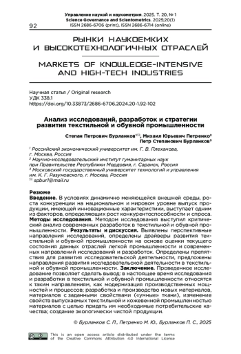 БУРЛАНКОВ С. П., ПЕТРЕНКО М. Ю., БУРЛАНКОВ П. С. АНАЛИЗ ИССЛЕДОВАНИЙ, РАЗРАБОТОК И СТРАТЕГИИ РАЗВИТИЯ ТЕКСТИЛЬНОЙ И ОБУВНОЙ ПРОМЫШЛЕННОСТИ // УПРАВЛЕНИЕ НАУКОЙ И НАУКОМЕТРИЯ. 2025. Т. 20 № 1