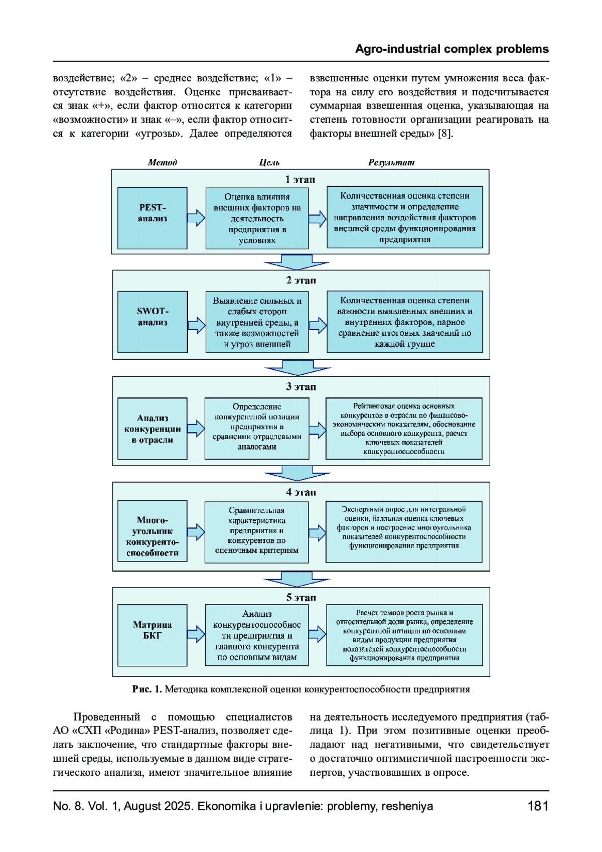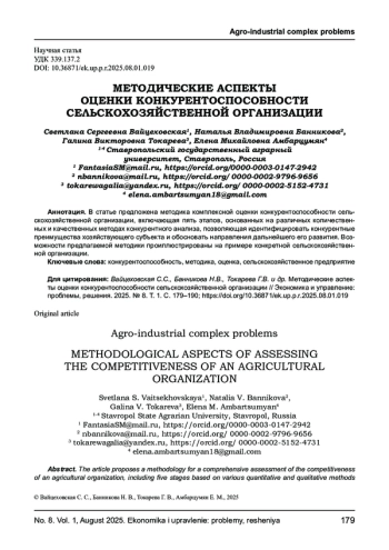 В статье предложена методика комплексной оценки конкурентоспособности сельскохозяйственной организации, включающая пять этапов, основанных на различных количественных и качественных методах конкурентного анализа, позволяющая идентифицировать конкурентные преимущества хозяйствующего субъекта и обосновать направления дальнейшего его развития. Возможности предлагаемой методики проиллюстрированы на примере конкретной сельскохозяйственной организации.
