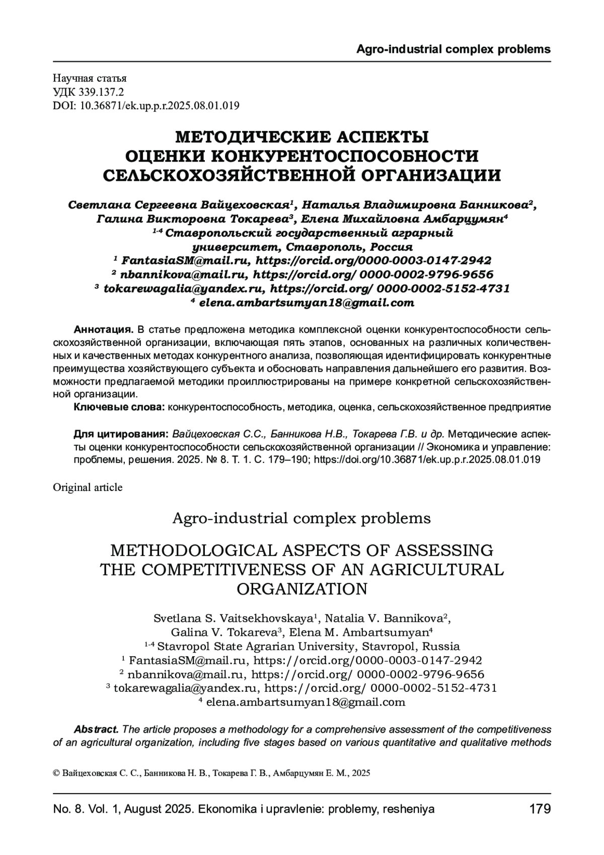 3. Загрутдинов А.Р. Методические подходы исследования конкурентоспособности сельскохозяйственных организаций // Конкурентоспособность в глобальном мире: экономика, наука, технологии. 2024. № 2. С. 114-119. EDN: AEZOYP