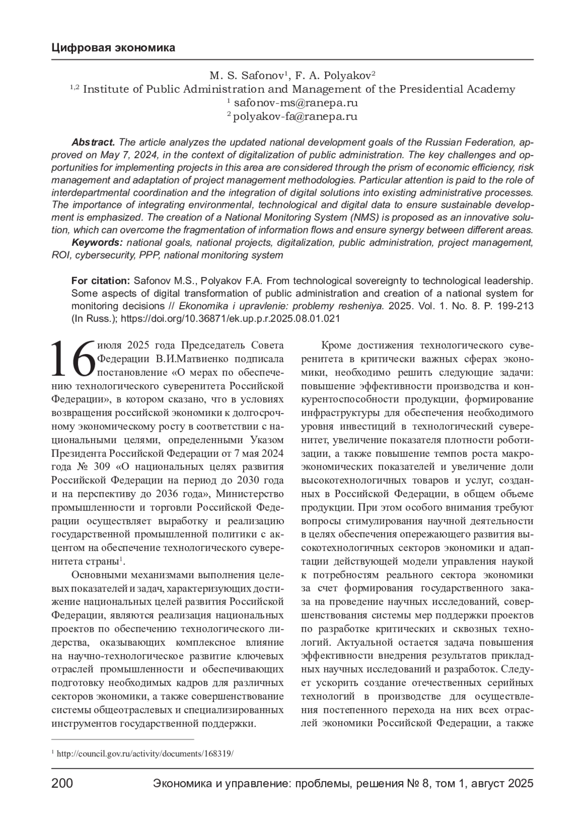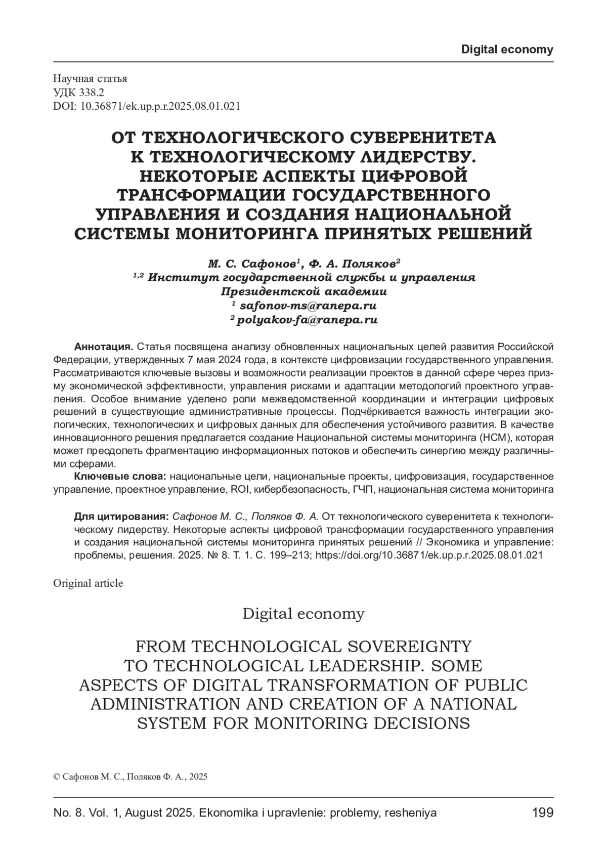 Статья посвящена анализу обновленных национальных целей развития Российской Федерации, утвержденных 7 мая 2024 года, в контексте цифровизации государственного управления. Рассматриваются ключевые вызовы и возможности реализации проектов в данной сфере через призму экономической эффективности, управления рисками и адаптации методологий проектного управления. Особое внимание уделено роли межведомственной координации и интеграции цифровых решений в существующие административные процессы. Подчёркивается важность интеграции экологических, технологических и цифровых данных для обеспечения устойчивого развития. В качестве инновационного решения предлагается создание Национальной системы мониторинга (НСМ), которая может преодолеть фрагментацию информационных потоков и обеспечить синергию между различными сферами.