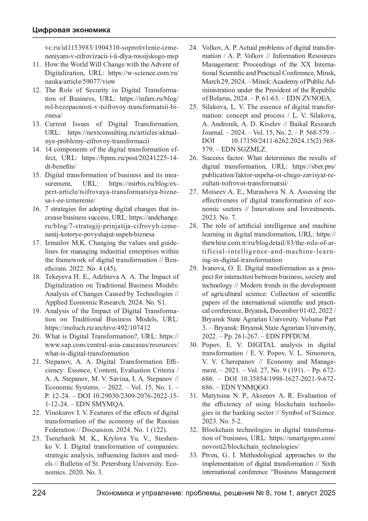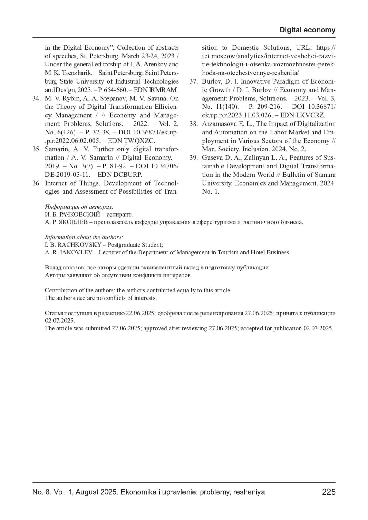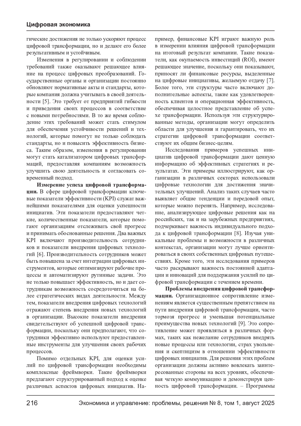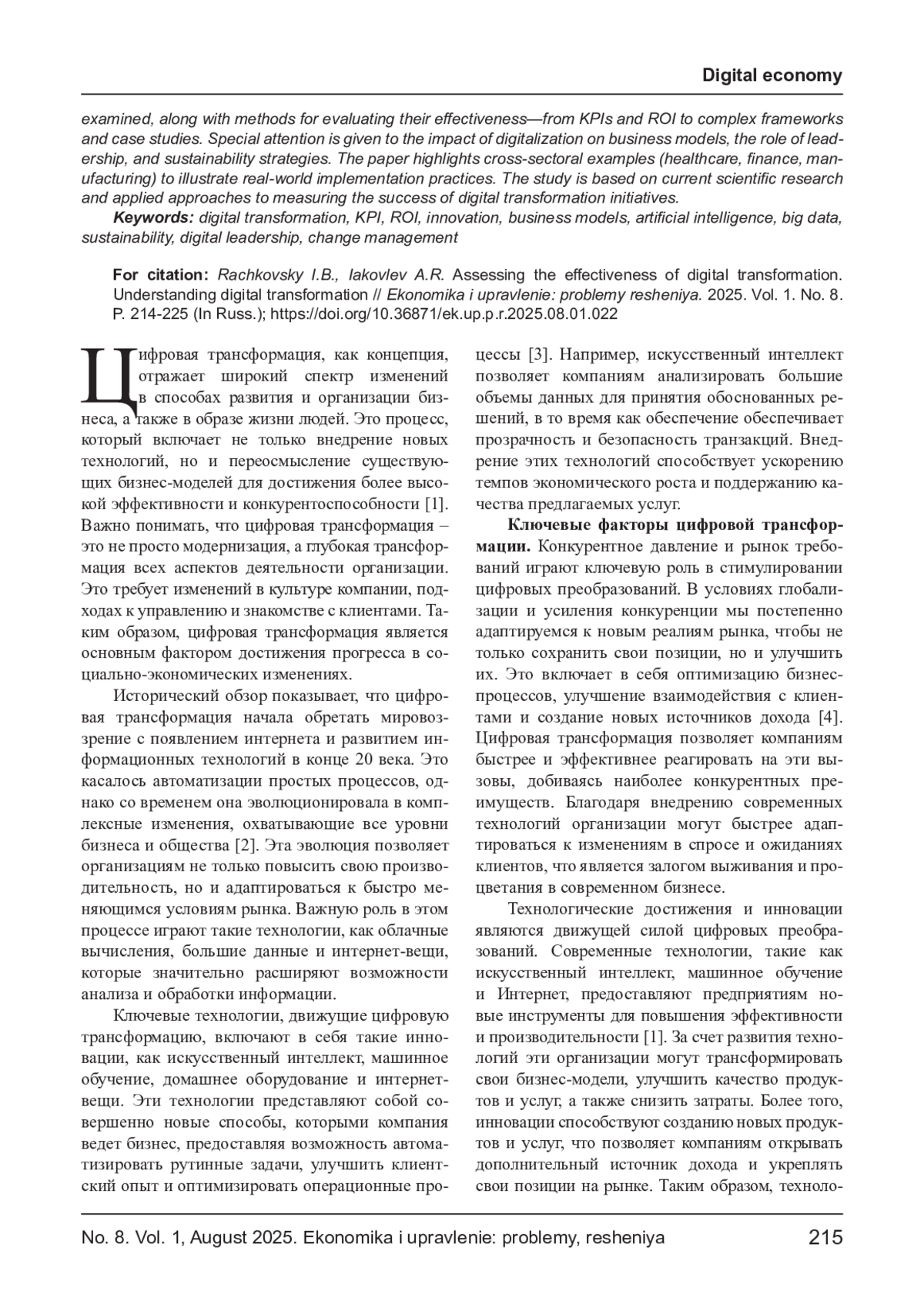 РАЧКОВСКИЙ И. Б., ЯКОВЛЕВ А. Р. ОЦЕНКА ЭФФЕКТИВНОСТИ ЦИФРОВОЙ ТРАНСФОРМАЦИИ. ПОНИМАНИЕ ЦИФРОВОЙ ТРАНСФОРМАЦИИ // ЭКОНОМИКА И УПРАВЛЕНИЕ: ПРОБЛЕМЫ, РЕШЕНИЯ. 2025. ТОМ 1 № 8