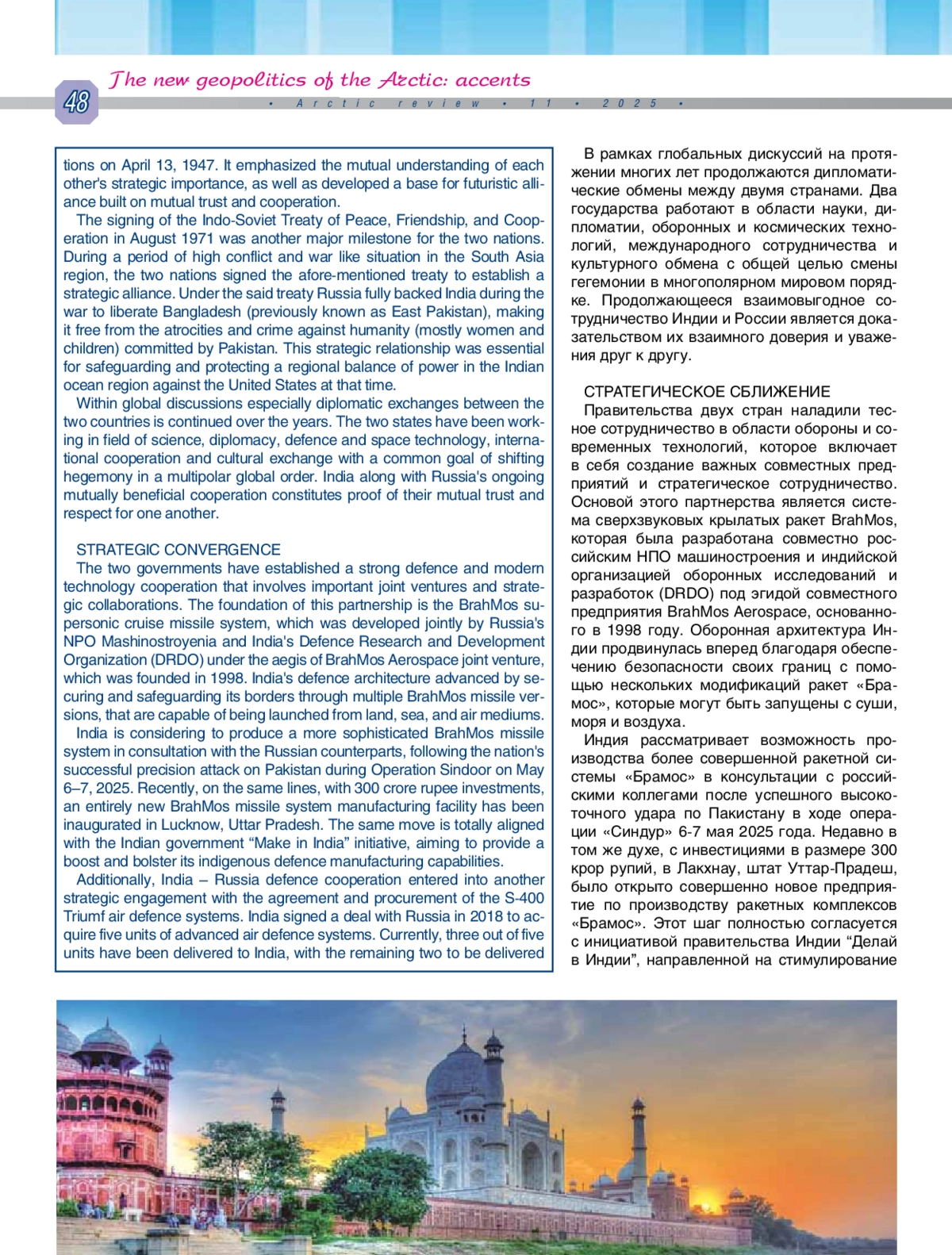 В современном динамичном мире с разнообразными ландшафтами и расходящимися национальными интересами борьба за природные ресурсы значительно усилила напряженность в Арктическом регионе, что полностью изменило регион в геополитическом плане. Географическое положение Российской Федерации, занимающей более 53% территории Арктического региона, позволяет ей возглавлять любое стратегическое взаимодействие, защищая свои собственные стратегические интересы. Принимая во внимание, что Индия с ее Арктической политикой до 2022 года, критическими научными исследованиями и устойчивыми практиками, а также прочным партнерством с Россией, твердо намерена сотрудничать на постоянно развивающемся театре военных действий, ориентируясь на согласованные национальные интересы, экономическую надежность, энергетическую безопасность, научные исследования и стратегическую приверженность во главу угла.