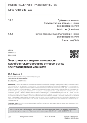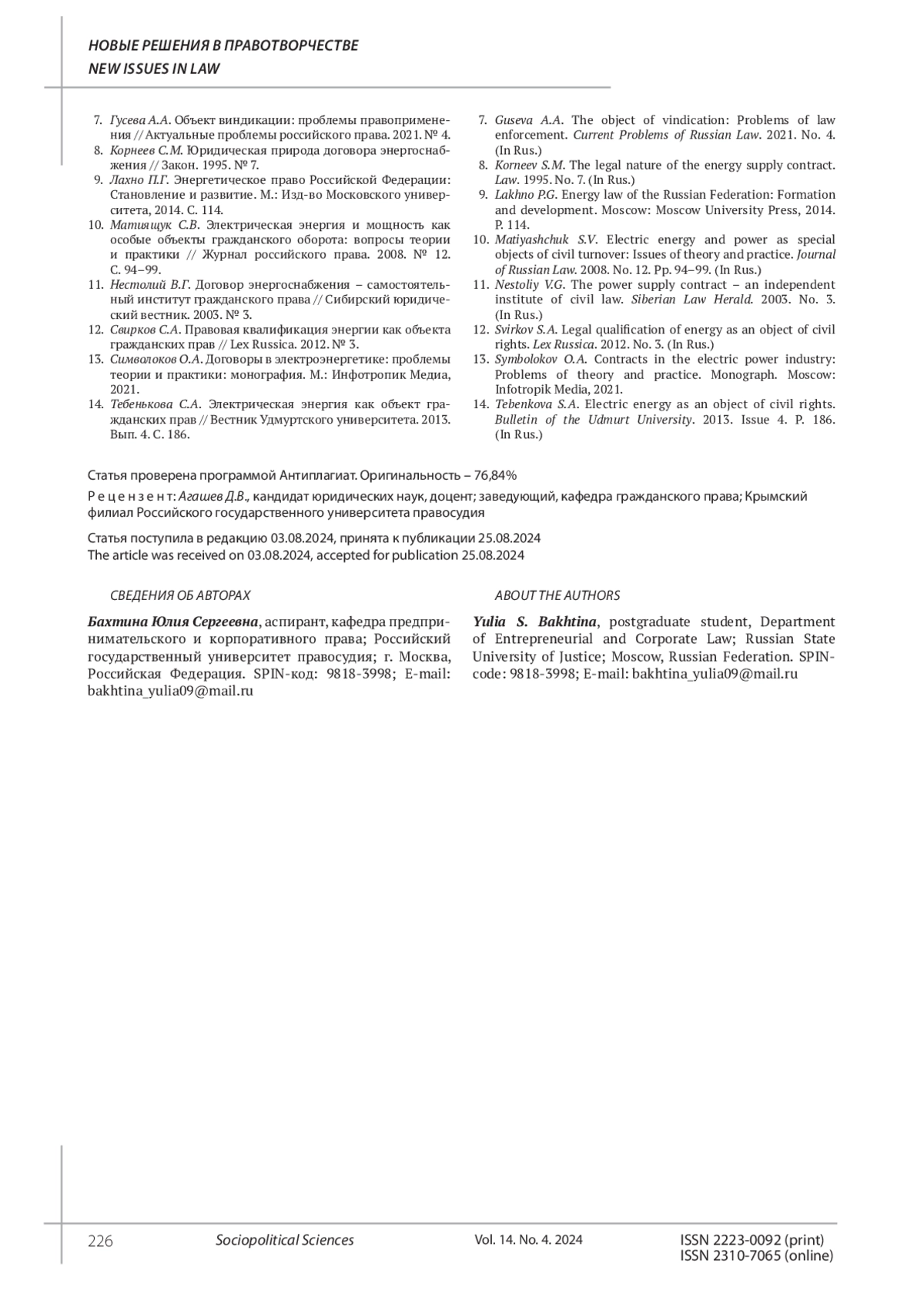 14. Тебенькова С.А. Электрическая энергия как объект гражданских прав // Вестник Удмуртского университета. 2013. Вып. 4. С. 186. EDN: RGSKPX