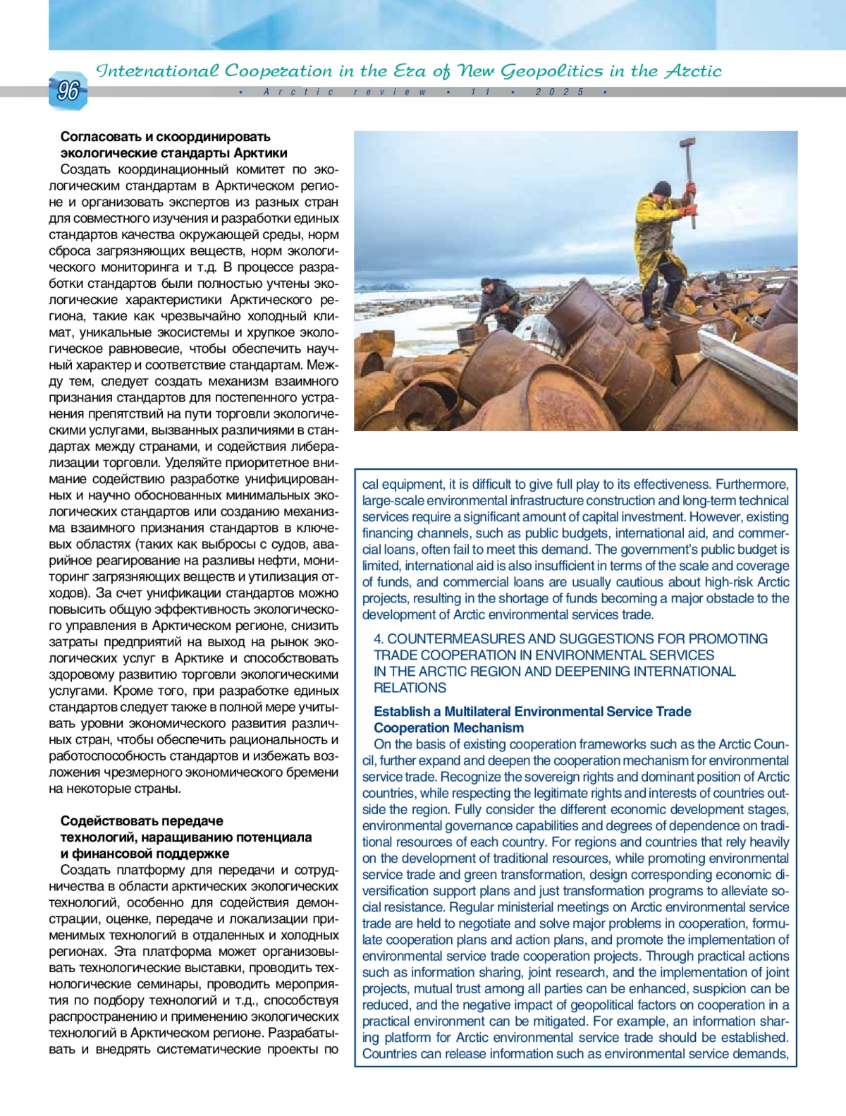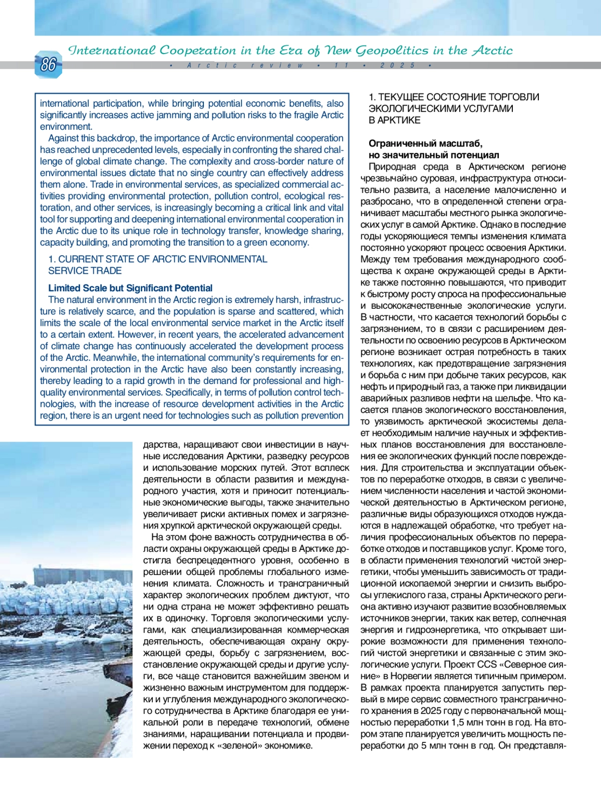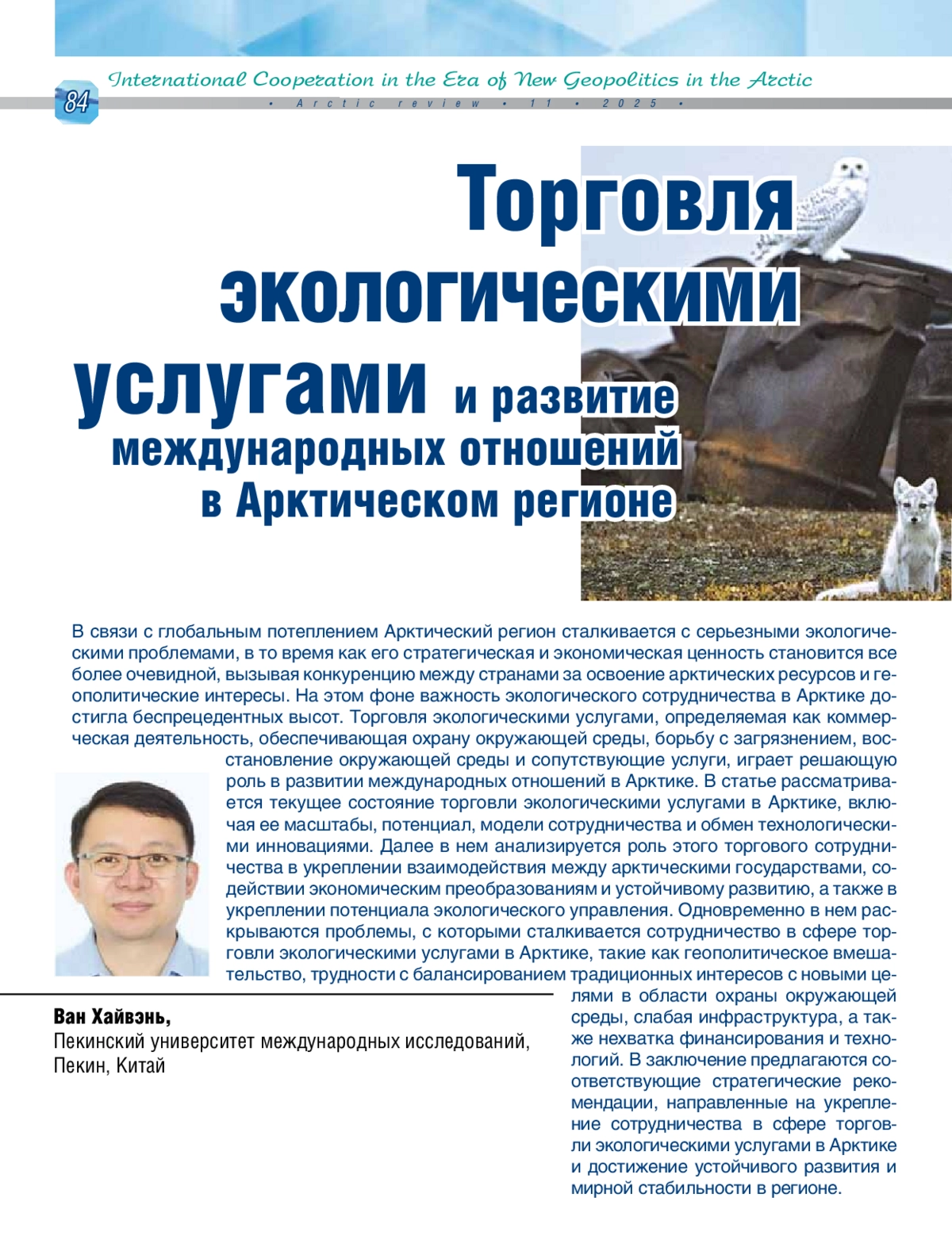 В связи с глобальным потеплением Арктический регион сталкивается с серьезными экологическими проблемами, в то время как его стратегическая и экономическая ценность становится все более очевидной, вызывая конкуренцию между странами за освоение арктических ресурсов и геополитические интересы. На этом фоне важность экологического сотрудничества в Арктике достигла беспрецедентных высот. Торговля экологическими услугами, определяемая как коммерческая деятельность, обеспечивающая охрану окружающей среды, борьбу с загрязнением, восстановление окружающей среды и сопутствующие услуги, играет решающую роль в развитии международных отношений в Арктике. В статье рассматривается текущее состояние торговли экологическими услугами в Арктике, включая ее масштабы, потенциал, модели сотрудничества и обмен технологическими инновациями. Далее в нем анализируется роль этого торгового сотрудничества в укреплении взаимодействия между арктическими государствами, содействии экономическим преобразованиям и устойчивому развитию, а также в укреплении потенциала экологического управления. Одновременно в нем раскрываются проблемы, с которыми сталкивается сотрудничество в сфере торговли экологическими услугами в Арктике, такие как геополитическое вмешательство, трудности с балансированием традиционных интересов с новыми целями в области охраны окружающей среды, слабая инфраструктура, а также нехватка финансирования и технологий. В заключение предлагаются соответствующие стратегические рекомендации, направленные на укрепление сотрудничества в сфере торговли экологическими услугами в Арктике и достижение устойчивого развития и мирной стабильности в регионе.