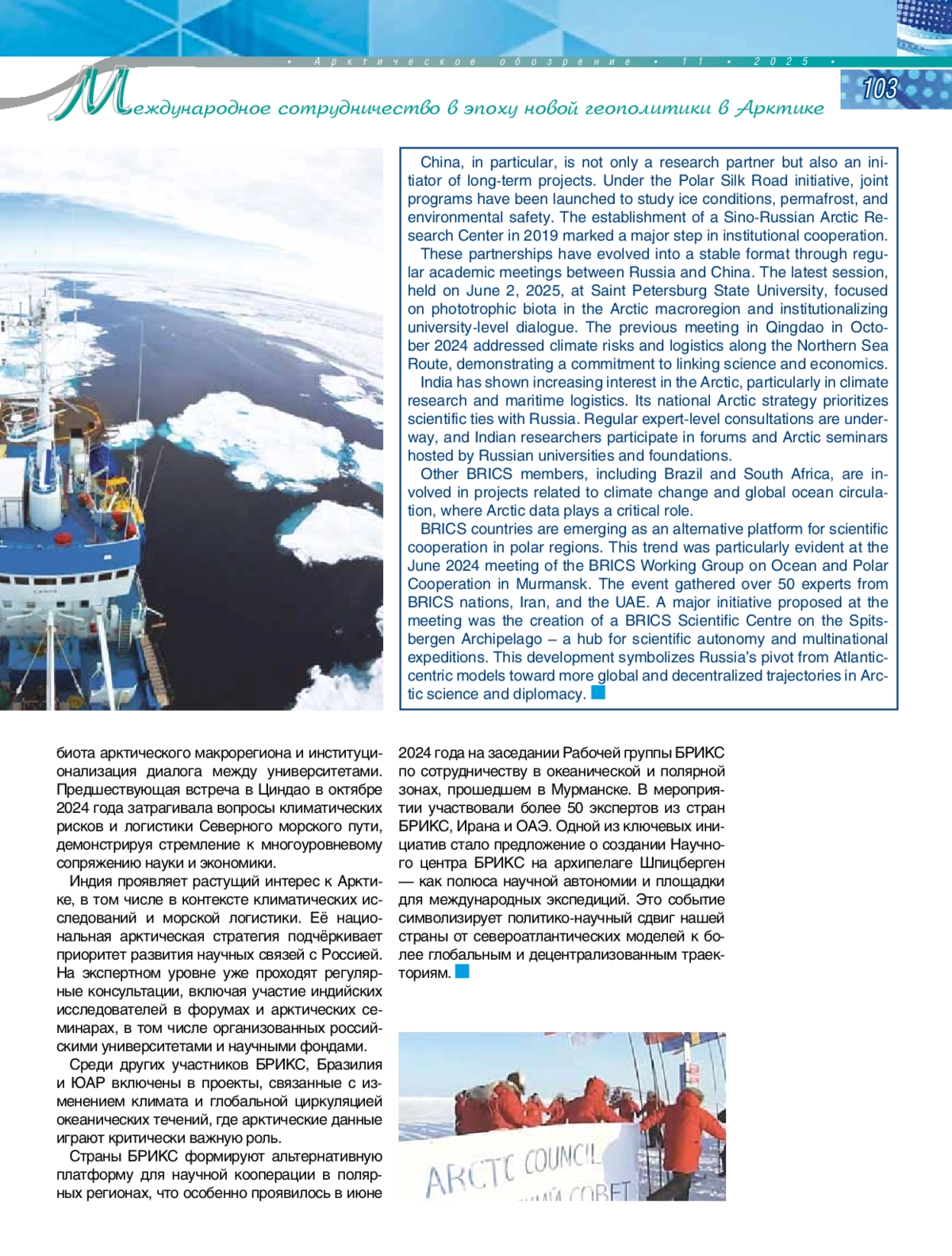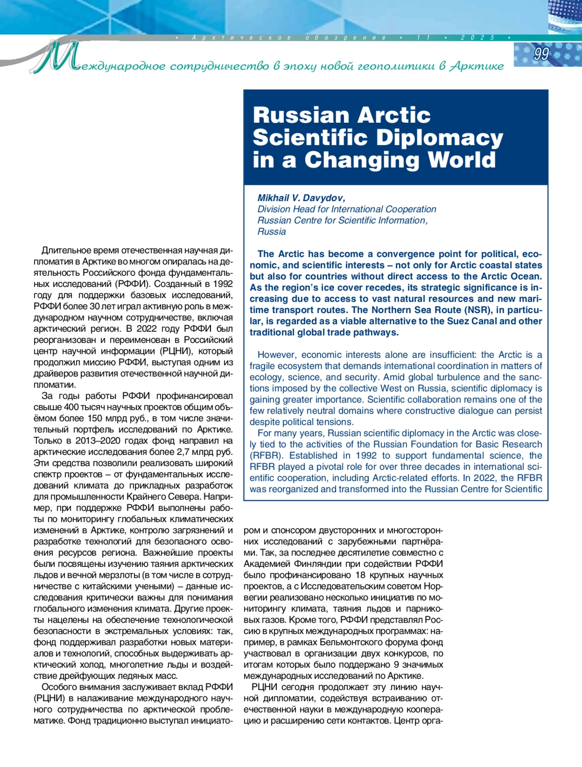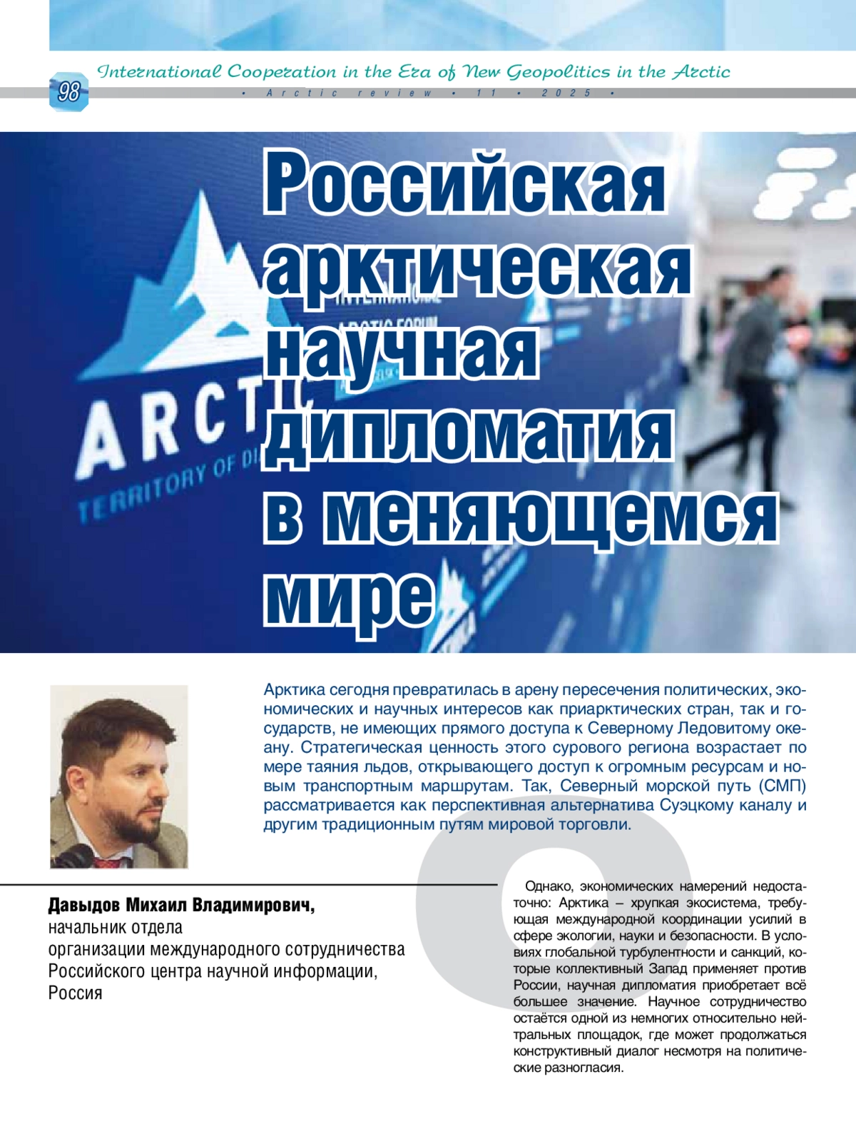 Однако, экономических намерений недостаточно: Арктика – хрупкая экосистема, требующая международной координации усилий в сфере экологии, науки и безопасности. В условиях глобальной турбулентности и санкций, которые коллективный Запад применяет против России, научная дипломатия приобретает всё большее значение. Научное сотрудничество остаётся одной из немногих относительно нейтральных площадок, где может продолжаться конструктивный диалог несмотря на политические разногласия.