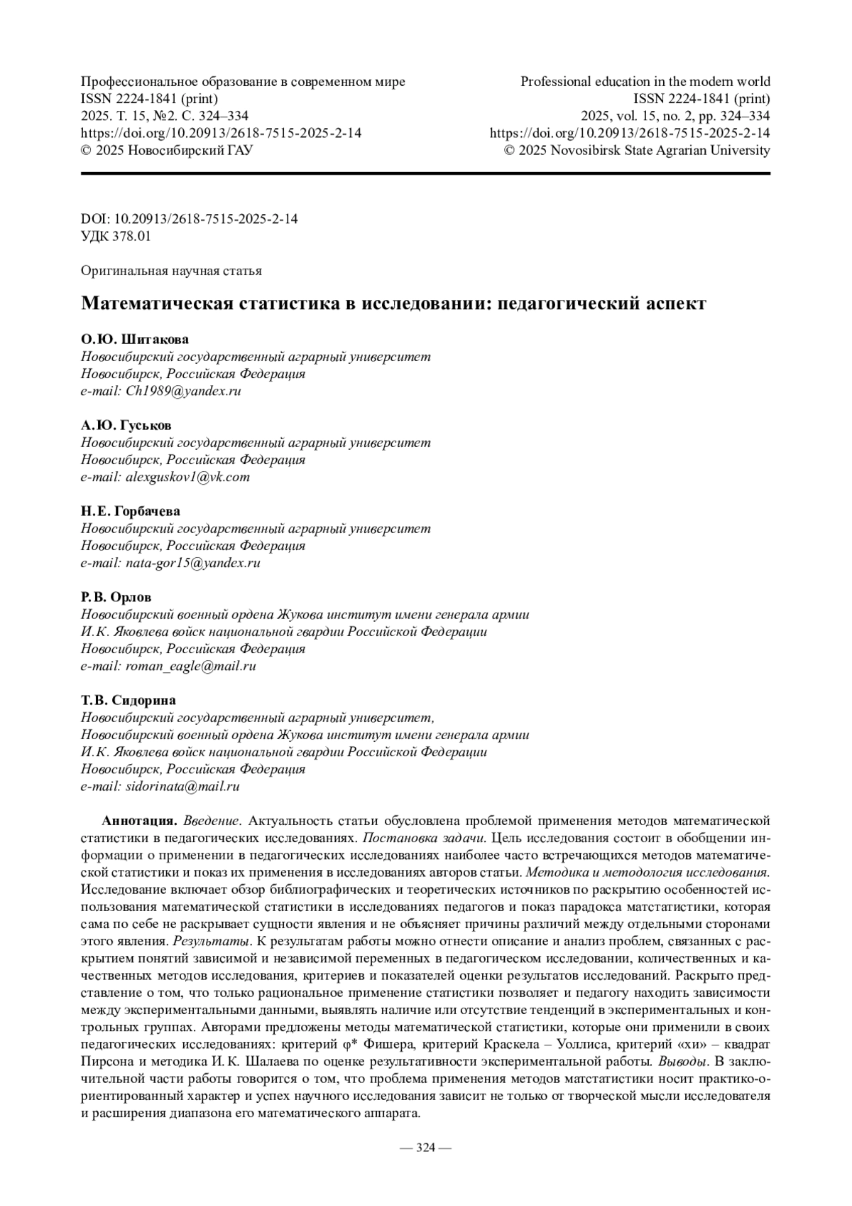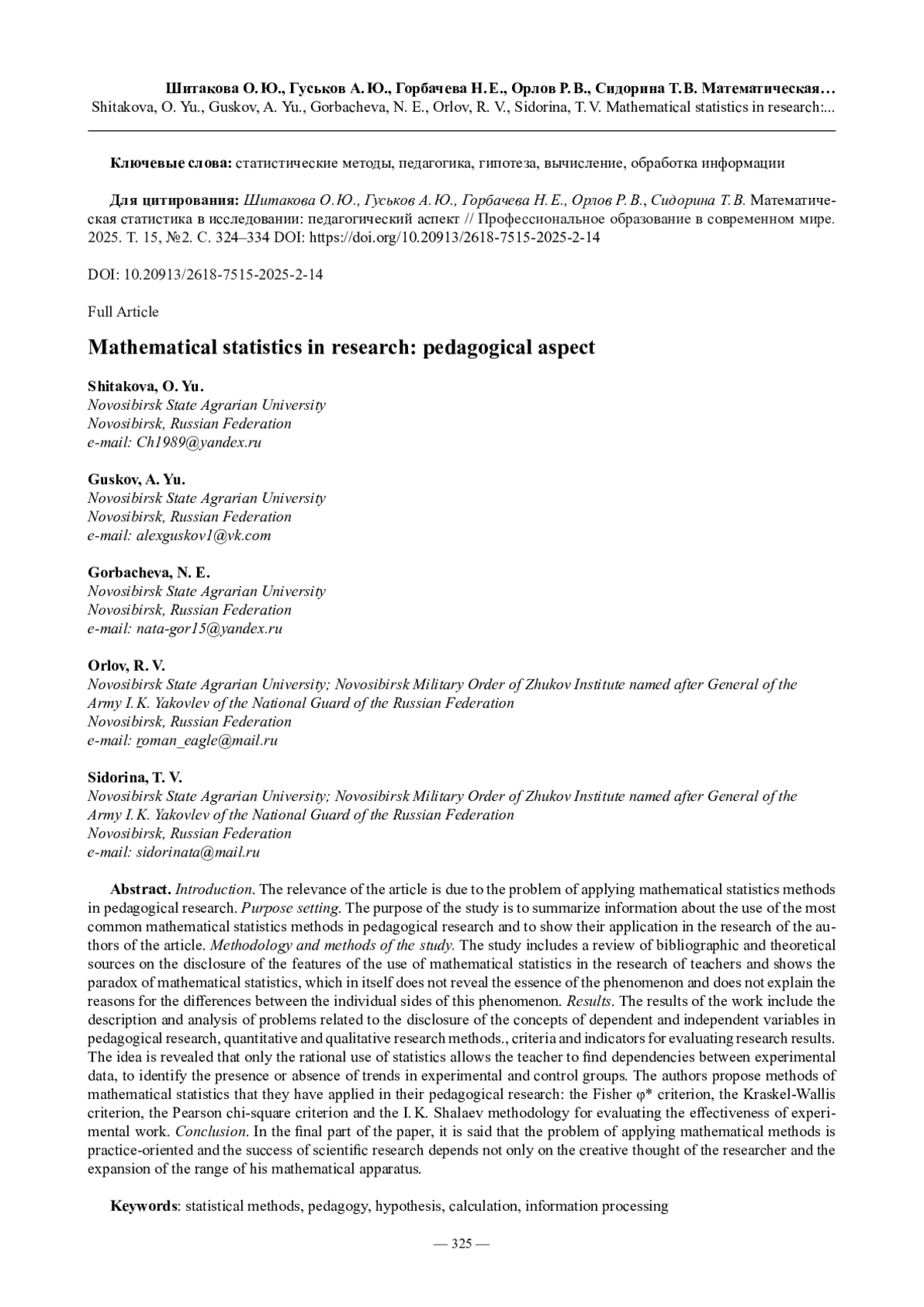 Результаты. К результатам работы можно отнести описание и анализ проблем, связанных с раскрытием понятий зависимой и независимой переменных в педагогическом исследовании, количественных и качественных методов исследования, критериев и показателей оценки результатов исследований. Раскрыто представление о том, что только рациональное применение статистики позволяет и педагогу находить зависимости между экспериментальными данными, выявлять наличие или отсутствие тенденций в экспериментальных и контрольных группах. Авторами предложены методы математической статистики, которые они применили в своих педагогических исследованиях: критерий φ* Фишера, критерий Краскела – Уоллиса, критерий «хи» – квадрат Пирсона и методика И. К. Шалаева по оценке результативности экспериментальной работы.