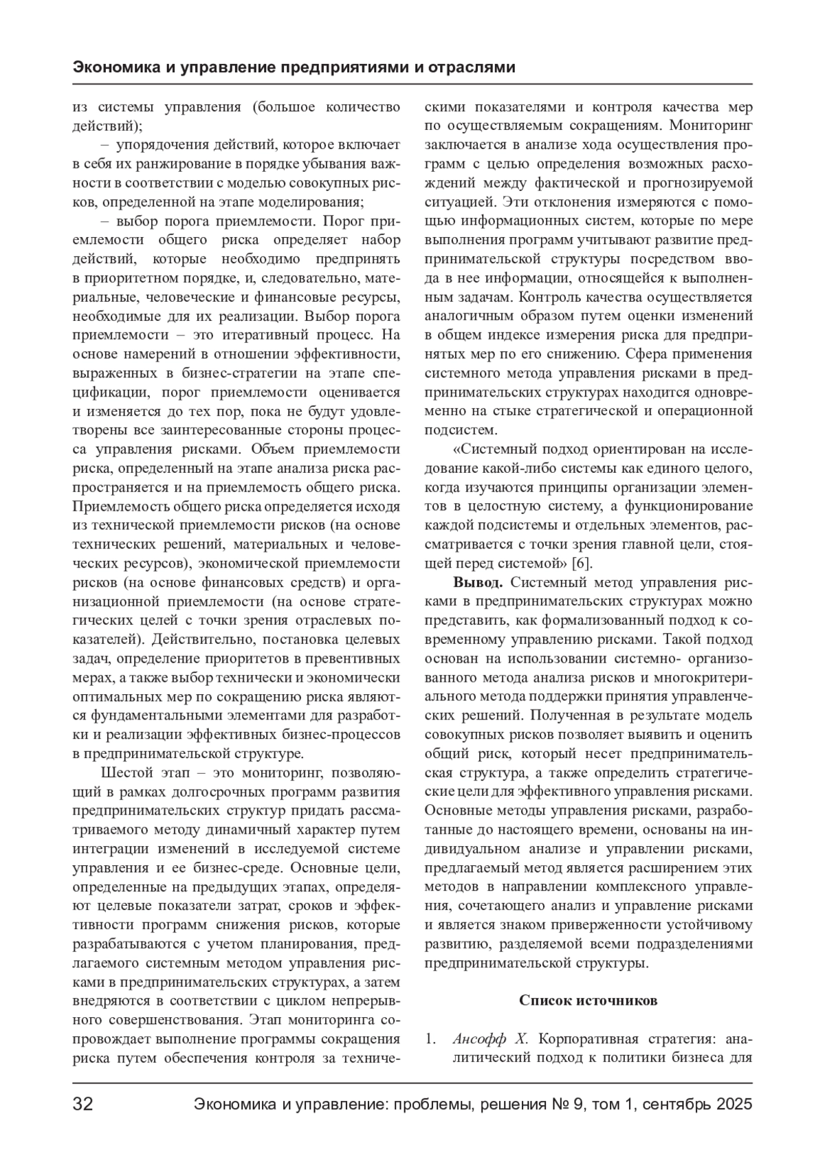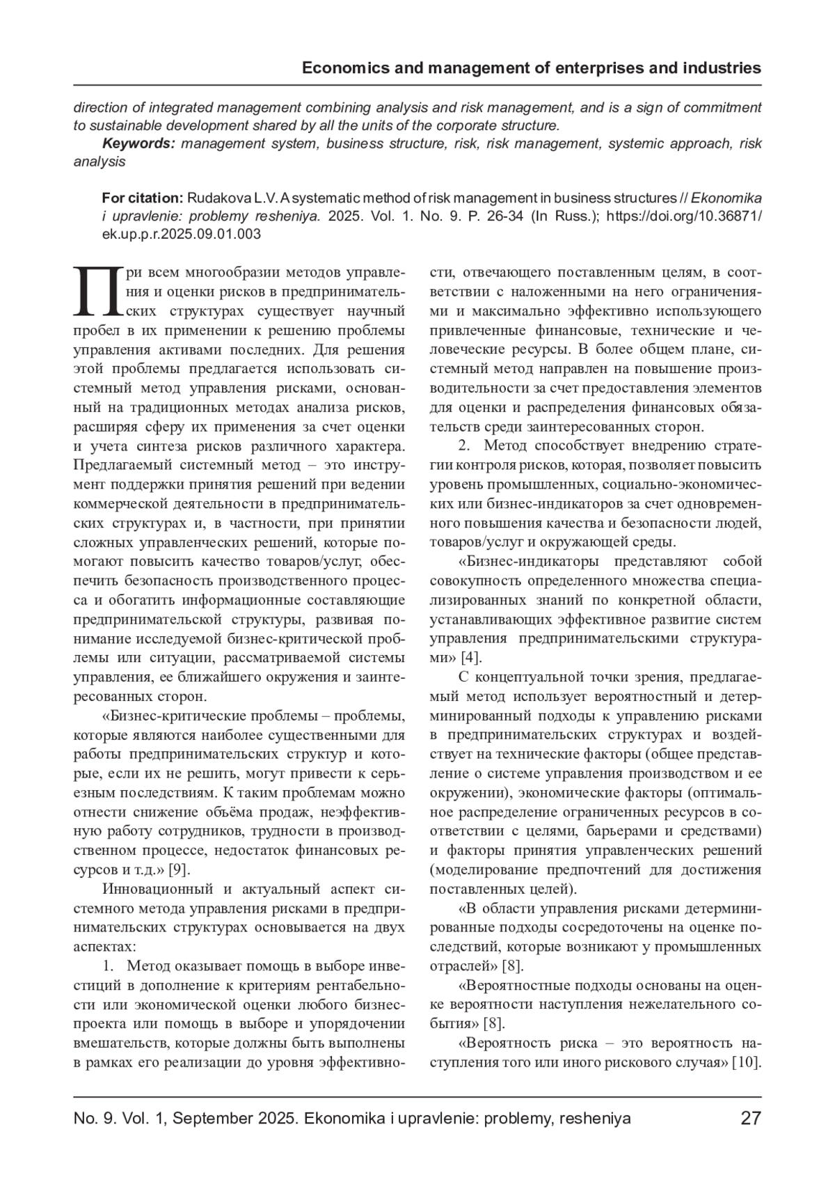 РУДАКОВА Л. В. СИСТЕМНЫЙ МЕТОД УПРАВЛЕНИЯ РИСКАМИ В ПРЕДПРИНИМАТЕЛЬСКИХ СТРУКТУРАХ // ЭКОНОМИКА И УПРАВЛЕНИЕ: ПРОБЛЕМЫ, РЕШЕНИЯ. 2025. ТОМ 1 № 9