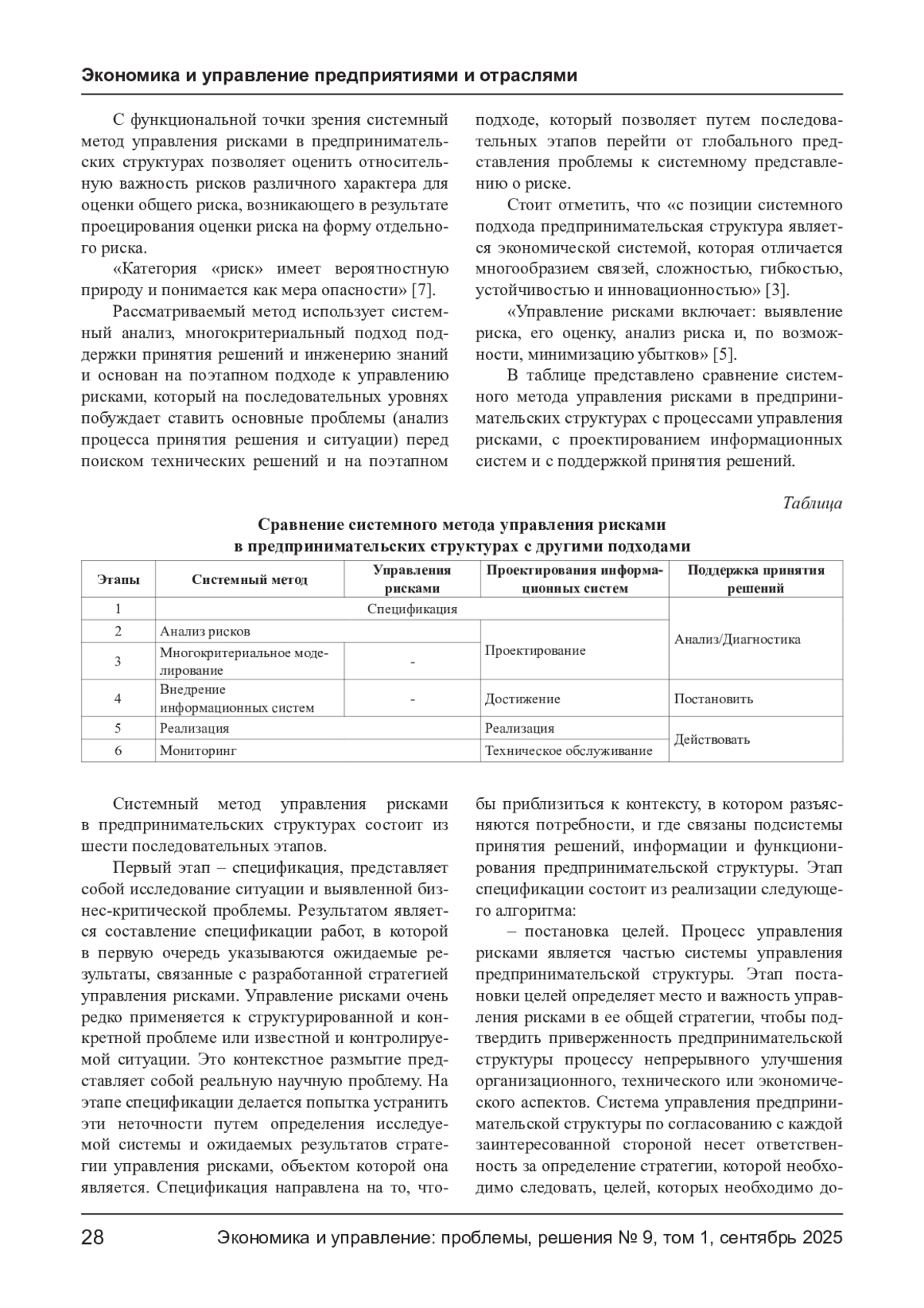 Статья: СИСТЕМНЫЙ МЕТОД УПРАВЛЕНИЯ РИСКАМИ В ПРЕДПРИНИМАТЕЛЬСКИХ СТРУКТУРАХ (2025)