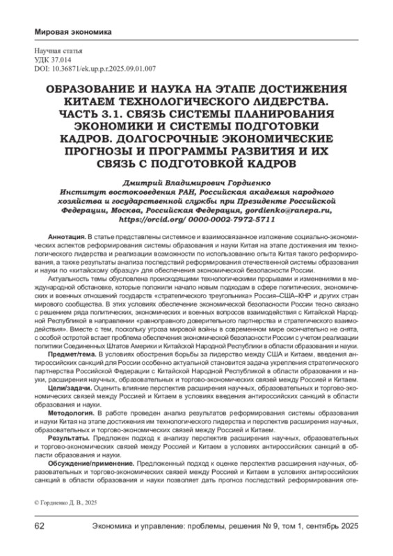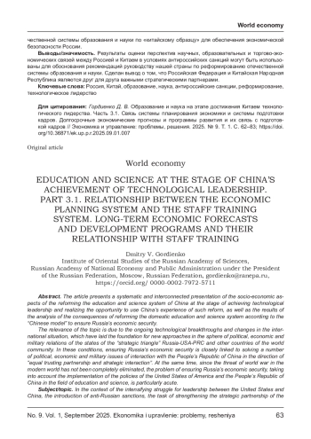ГОРДИЕНКО Д. В. ОБРАЗОВАНИЕ И НАУКА НА ЭТАПЕ ДОСТИЖЕНИЯ КИТАЕМ ТЕХНОЛОГИЧЕСКОГО ЛИДЕРСТВА. ЧАСТЬ 3.1. СВЯЗЬ СИСТЕМЫ ПЛАНИРОВАНИЯ ЭКОНОМИКИ И СИСТЕМЫ ПОДГОТОВКИ КАДРОВ. ДОЛГОСРОЧНЫЕ ЭКОНОМИЧЕСКИЕ ПРОГНОЗЫ И ПРОГРАММЫ РАЗВИТИЯ И ИХ СВЯЗЬ С ПОДГОТОВКОЙ КАДРОВ // ЭКОНОМИКА И УПРАВЛЕНИЕ: ПРОБЛЕМЫ, РЕШЕНИЯ. 2025. ТОМ 1 № 9