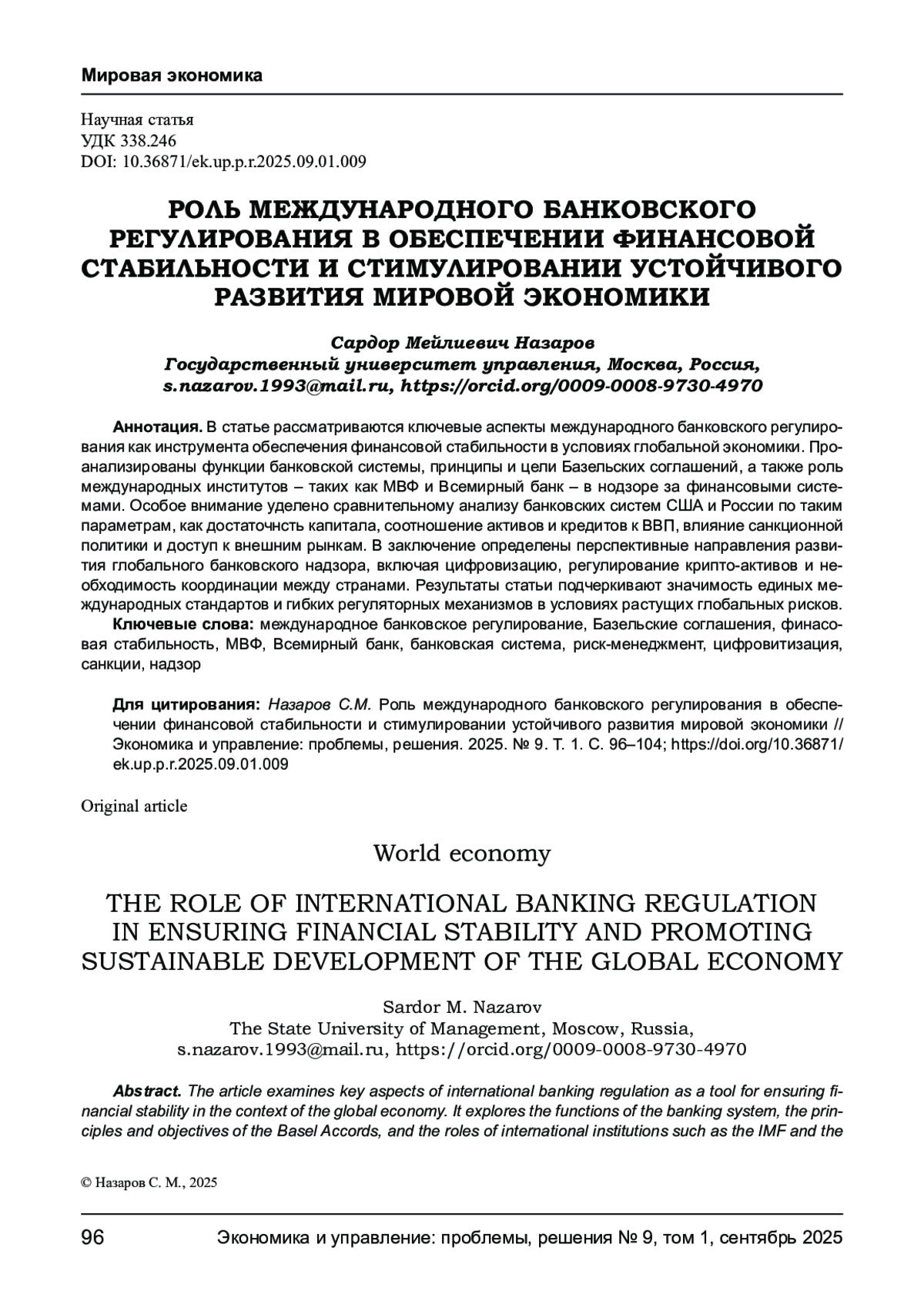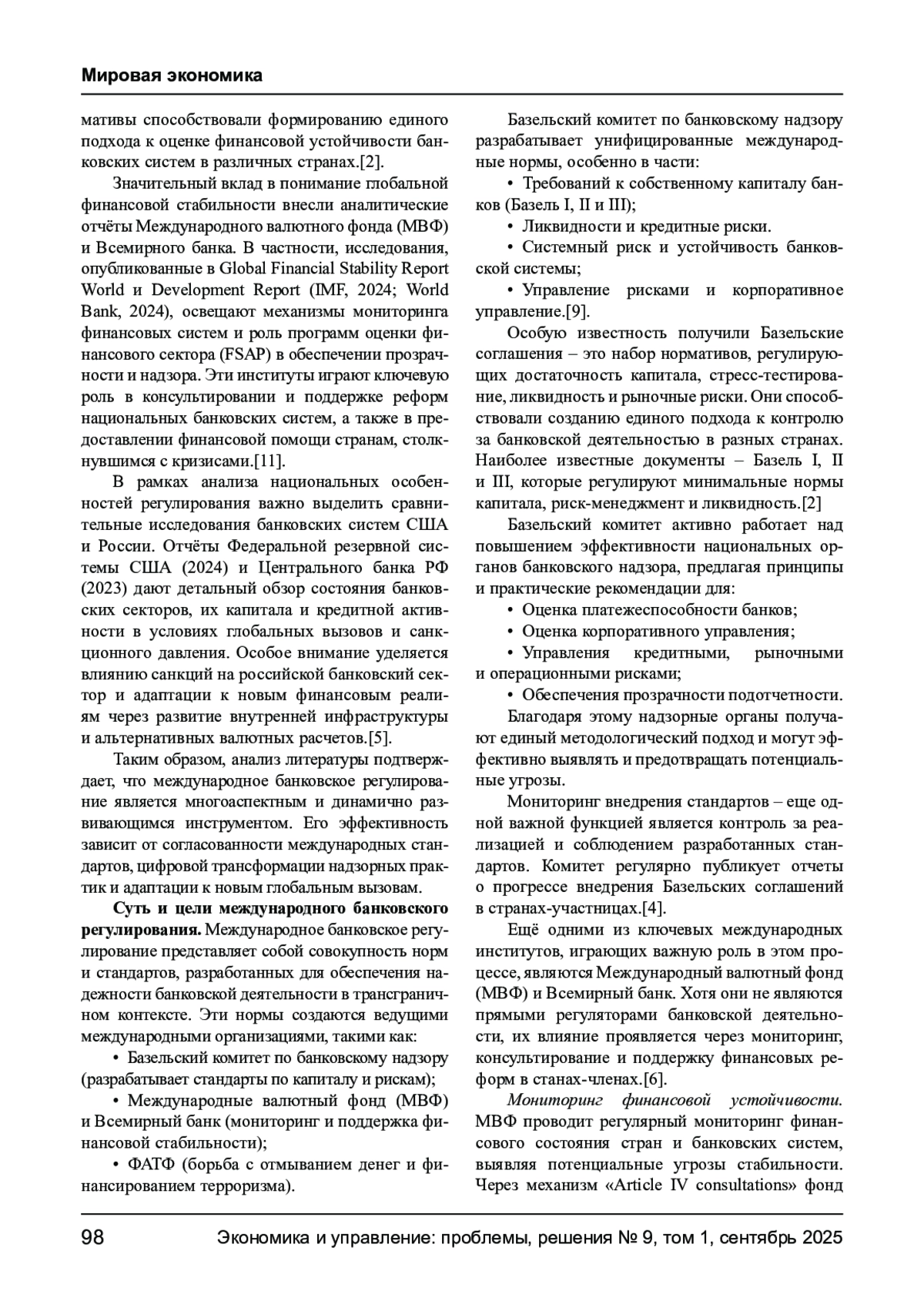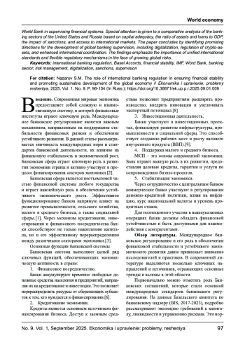 В статье рассматриваются ключевые аспекты международного банковского регулирования как инструмента обеспечения финансовой стабильности в условиях глобальной экономики. Проанализированы функции банковской системы, принципы и цели Базельских соглашений, а также роль международных институтов - таких как МВФ и Всемирный банк - в нодзоре за финансовыми системами. Особое внимание уделено сравнительному анализу банковских систем США и России по таким параметрам, как достаточнсть капитала, соотношение активов и кредитов к ВВП, влияние санкционной политики и доступ к внешним рынкам. В заключение определены перспективные направления развития глобального банковского надзора, включая цифровизацию, регулирование крипто-активов и необходимость координации между странами. Результаты статьи подчеркивают значимость единых международных стандартов и гибких регуляторных механизмов в условиях растущих глобальных рисков.