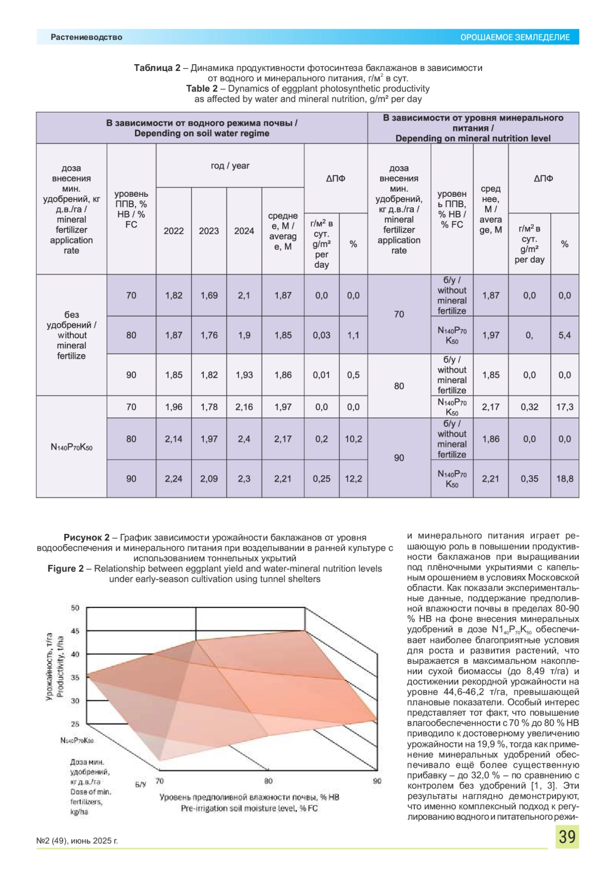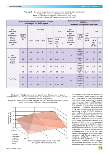 Изучены закономерности роста и формирования ранних баклажанов при использовании капельного орошения в южных районах Московской области. Эксперимент проводился по схеме с двумя переменными: первый фактор (А) отражал уровень увлажнения, второй фактор (В) – минеральное питание. В рамках полевых испытаний исследовалось влияние влажности грунта и внесения питательных веществ на вегетацию, формирование плодов и урожайность сорта «Черный опал», культивируемого под временными тоннельными укрытиями для получения ранней продукции. Анализировалась скорость наращивания органической массы как индикатор благоприятности агрономических условий. Отдельное внимание уделялось изучению фотосинтеза, который оценивался по следующим критериям: размеру листовой поверхности, фотосинтетической активности и продуктивности фотосинтеза. Пик развития листьев (27,4-32,8 тыс. м²/га) отмечался на 20-й день после начала плодоношения, а общий фотосинтетический потенциал за сезон колебался в пределах от 1580 до 2167 тыс. м²·дней/га. Повышение качества полива и питания положительно влияло на эти параметры. Полученные данные помогают не только контролировать состояние посадок, но и прогнозировать их продуктивность, а также совершенствовать агротехнические методы выращивания. Выявлена взаимосвязь между режимом орошения, применением минеральных удобрений и эффективностью фотосинтеза. Полученные результаты свидетельствуют о том, что для получения урожайности на уровне 40 т/га и выше необходимо поддерживать предполивную влажность почвы на уровне не ниже 80 % НВ и применять минеральные удобрения в дозе N P K. 140 70 50 При этом максимальная продуктивность достигается при сочетании 90 % НВ с указанной дозой удобрений. Такой подход позволяет минимизировать расход воды на единицу продукции и добиваться стабильно высокого уровня урожая. Таким образом, проведенная работа позволила выявить оптимальные агротехнические условия, способствующие максимальной продуктивности и рациональному использованию ресурсов.