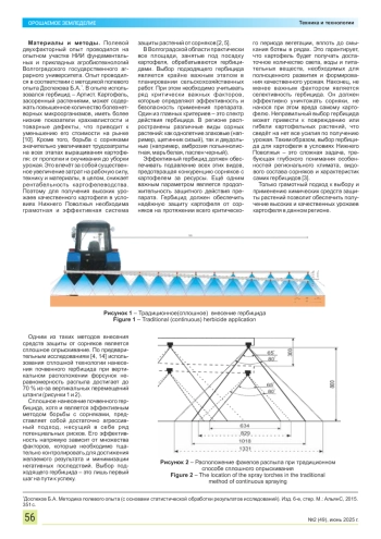 В современном сельском хозяйстве картофель остается одной из самых распространенных и востребованных культур в мире, и Россия не является исключением. Первоочередной задачей обеспечения высокой его урожайности является минимизация негативного воздействия на окружающую среду и здоровье человека. Интенсивное применение химических средств защиты растений, в частности гербицидов, стало традиционным инструментом в борьбе с сорной растительностью. Однако широко представленные на рынке препараты зачастую обладают высокой фитотоксичностью, оказывают отравляющее воздействие на растения и, сохраняясь в почве в течение длительного времени, негативно влияют на последующие культуры в севообороте. Рассматриваются различные технологии опрыскивания, традиционная с вертикально расположенными форсунками, а также опрыскивание навстречу направленными потоками от форсунок, расположенных под углом 45 градусов. Такое их расположение позволяет проводить обработку по полосам. Основная часть почвенного гербицида распределяется на верхней и наклонной частях гребня. Общая неравномерность составляет 8-12 %. Соответственно, качество нанесения рабочего раствора по абрису гребней вырастет до 4-х раз. Приводятся данные, свидетельствующие о возможности полосового процесса опрыскивания боковыми форсунками, что позволяет увеличить равномерность распределения капель по абрису гребней. Преимущества полосового внесения гербицидов по сравнению со сплошным опрыскиванием очевидны: так как обрабатывается лишь часть поля, экономия гербицида может достигать 50 % и более, что напрямую отражается на снижении затрат на приобретение химикатов и в целом, положительно сказывается на экономике сельскохозяйственного производства; также уменьшение количества используемого гербицида напрямую снижает риск загрязнения почвы и грунтовых вод, что положительно сказывается на экологической обстановке в регионе.