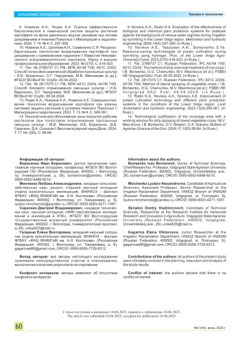 8. Новиков А.А., Родин К.А. Агроэкологическая оценка сортов картофеля при орошении в Нижнем Поволжье // Орошаемое земледелие. 2024. № 4(47). С. 40-44.