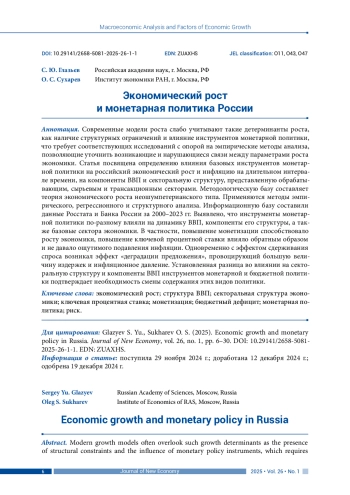 Современные модели роста слабо учитывают такие детерминанты роста, как наличие структурных ограничений и влияние инструментов монетарной политики, что требует соответствующих исследований с опорой на эмпирические методы анализа, позволяющие уточнить возникающие и нарушающиеся связи между параметрами роста экономики. Статья посвящена определению влияния базовых инструментов монетарной политики на российский экономический рост и инфляцию на длительном интервале времени, на компоненты ВВП и секторальную структуру, представленную обрабатывающим, сырьевым и трансакционным секторами. Методологическую базу составляет теория экономического роста неошумпетерианского типа. Применяются методы эмпирического, регрессионного и структурного анализа. Информационную базу составили данные Росстата и Банка России за 2000–2023 гг. Выявлено, что инструменты монетарной политики по-разному влияли на динамику ВВП, компоненты его структуры, а также базовые сектора экономики. В частности, повышение монетизации способствовало росту экономики, повышение ключевой процентной ставки влияло обратным образом и не давало ощутимого подавления инфляции. Одновременно с эффектом сдерживания спроса возникал эффект «деградации предложения», провоцирующий большую величину издержек и инфляционное давление. Установленная разница во влиянии на секторальную структуру и компоненты ВВП инструментов монетарной и бюджетной политики подтверждает необходимость смены содержания этих видов политики