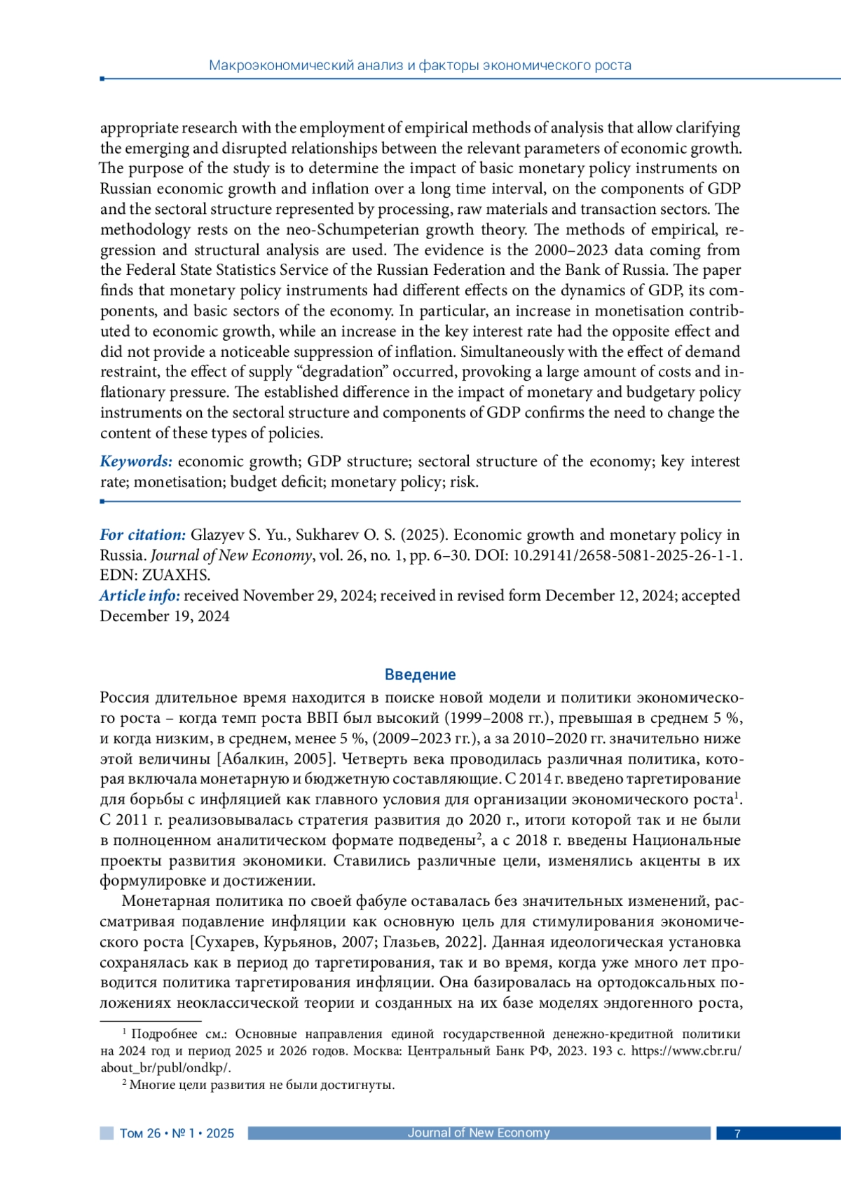 6. Глазьев С. Ю., Сухарев О. С. (2024a). Монетарная политика в России снижает активность экономики в период ее роста - это ли не успех? // Экономические стратегии. № 6. С. 48-55. EDN: TPMBVE