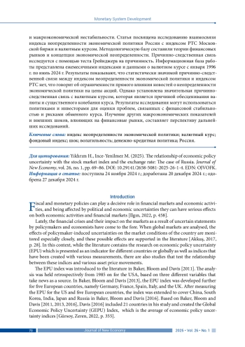 National economic policy uncertainty is a determinant of stock market volatility, decreased investor confidence, and macroeconomic instability. The study aims to examine the interaction between Russia’s Economic Policy Uncertainty Index (REPU), the Moscow Stock Exchange RTS Index (RTSI) and the exchange rate of US dollar to Russian ruble. Methodologically, the analysis relies on the theories of financial markets and the concept of economic uncertainty. The causality is investigated using the Granger causality test. The data is the monthly indices and exchange rates for January 1996 – July 2024. The findings indicate that there is no statistically significant causality from the REPU to the RTSI, which suggests that the direct impact of economic policy uncertainty news on stock prices is limited. However, a significant causation is established between the REPU and the exchange rate, indicating that policy uncertainty causes currency depreciation. This evidences that economic policy uncertainty plays an important role in exchange rate fluctuations. The insights derived from the study could help policymakers and investors assess issues related to financial stability and exchange rate risks. In future, the study could be extended to examine other macroeconomic indicators and external shocks influencing financial markets
