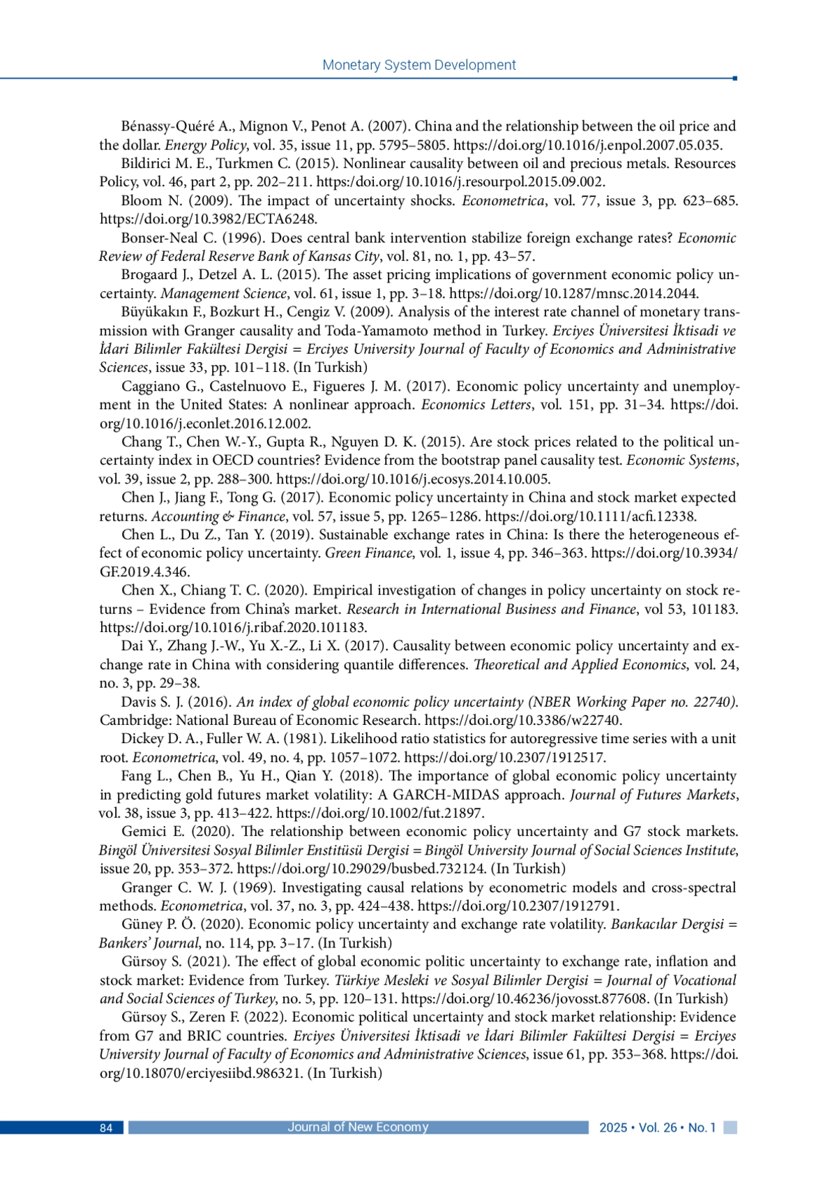 28. Gürsoy S. (2021). The effect of global economic politic uncertainty to exchange rate, inflation and stock market: Evidence from Turkey. Türkiye Mesleki ve Sosyal Bilimler Dergisi = Journal of Vocational and Social Sciences of Turkey, no. 5, pp. 120-131. (In Turkish). DOI: 10.46236/jovosst.877608