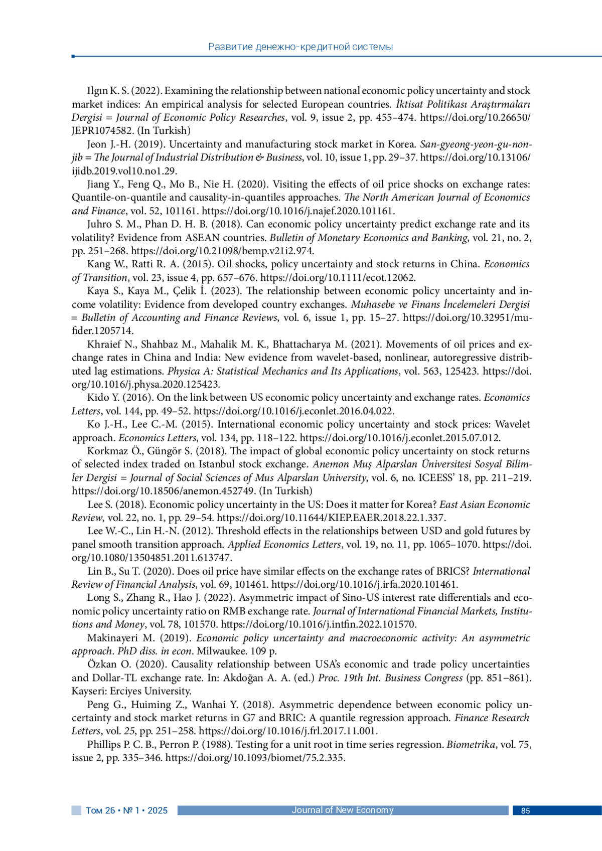 30. Ilgın K. S. (2022). Examining the relationship between national economic policy uncertainty and stock market indices: An empirical analysis for selected European countries. İktisat Politikası Araştırmaları Dergisi = Journal of Economic Policy Researches, vol. 9, issue 2, pp. 455-474. 10.26650/ JEPR1074582. (In Turkish). DOI: 10.26650/JEPR1074582