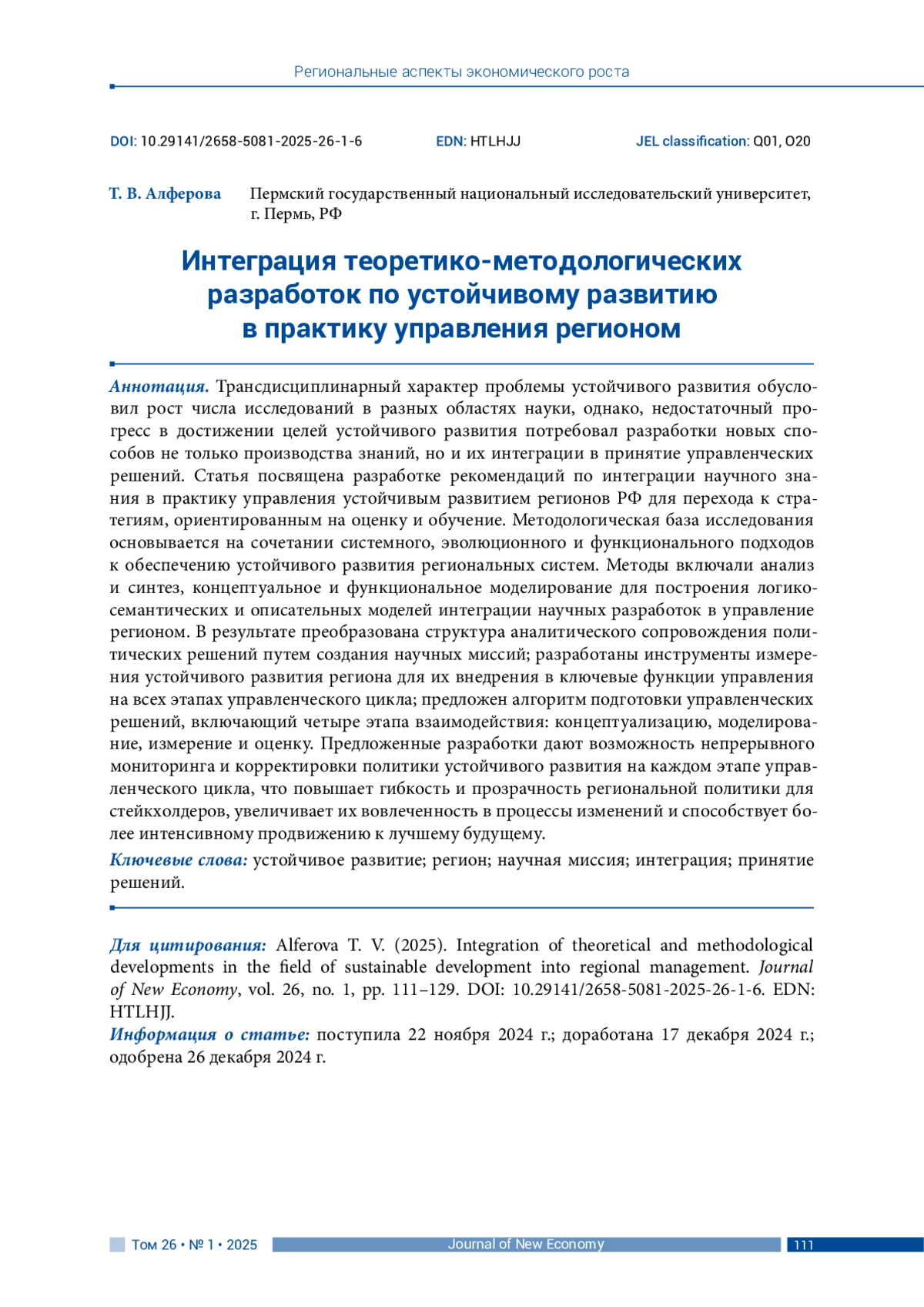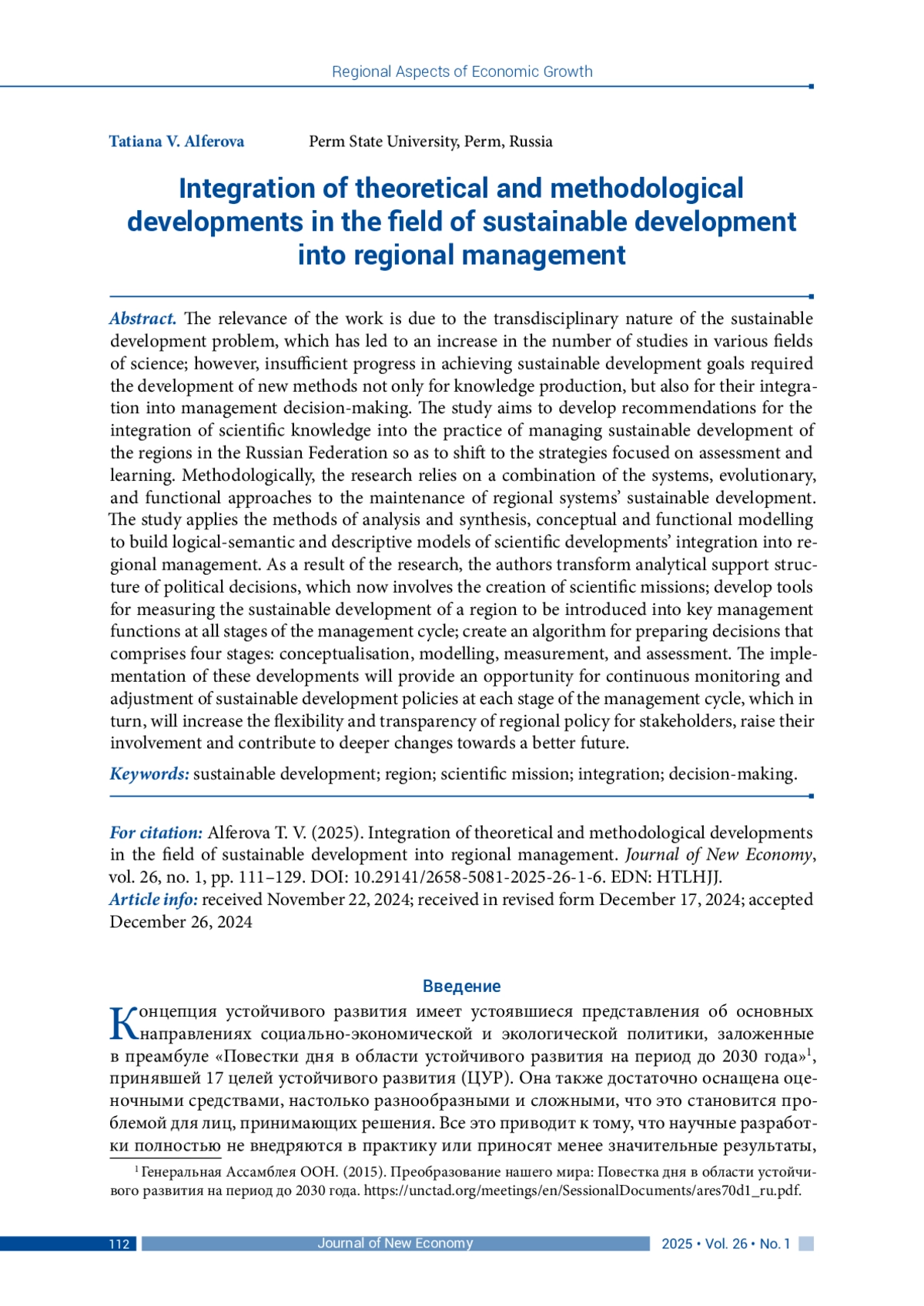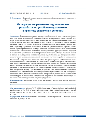 Трансдисциплинарный характер проблемы устойчивого развития обусловил рост числа исследований в разных областях науки, однако, недостаточный прогресс в достижении целей устойчивого развития потребовал разработки новых способов не только производства знаний, но и их интеграции в принятие управленческих решений. Статья посвящена разработке рекомендаций по интеграции научного знания в практику управления устойчивым развитием регионов РФ для перехода к стратегиям, ориентированным на оценку и обучение. Методологическая база исследования основывается на сочетании системного, эволюционного и функционального подходов к обеспечению устойчивого развития региональных систем. Методы включали анализ и синтез, концептуальное и функциональное моделирование для построения логикосемантических и описательных моделей интеграции научных разработок в управление регионом. В результате преобразована структура аналитического сопровождения политических решений путем создания научных миссий; разработаны инструменты измерения устойчивого развития региона для их внедрения в ключевые функции управления на всех этапах управленческого цикла; предложен алгоритм подготовки управленческих решений, включающий четыре этапа взаимодействия: концептуализацию, моделирование, измерение и оценку. Предложенные разработки дают возможность непрерывного мониторинга и корректировки политики устойчивого развития на каждом этапе управленческого цикла, что повышает гибкость и прозрачность региональной политики для стейкхолдеров, увеличивает их вовлеченность в процессы изменений и способствует более интенсивному продвижению к лучшему будущему