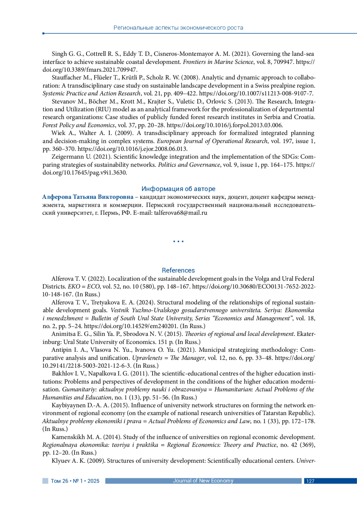 1. Алферова Т. В. (2022). Локализация целей устойчивого развития на примере регионов Приволжского и Уральского федеральных округов // ЭКО. Т. 52, № 10 (580). С. 148-167. DOI: 10.30680/ECO0131-7652-2022-10-148-167 EDN: CNDEHN