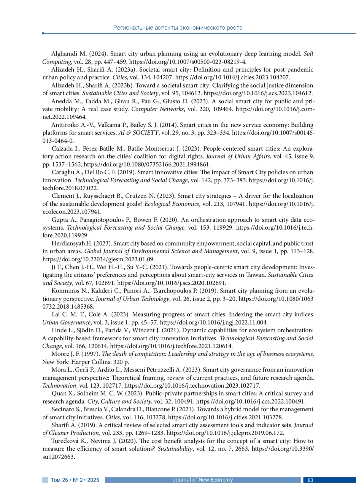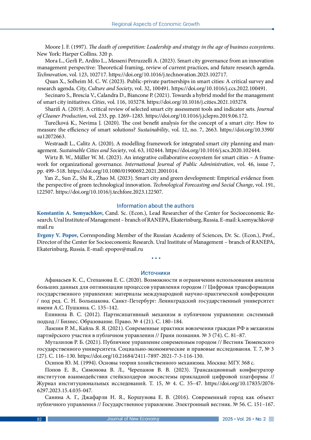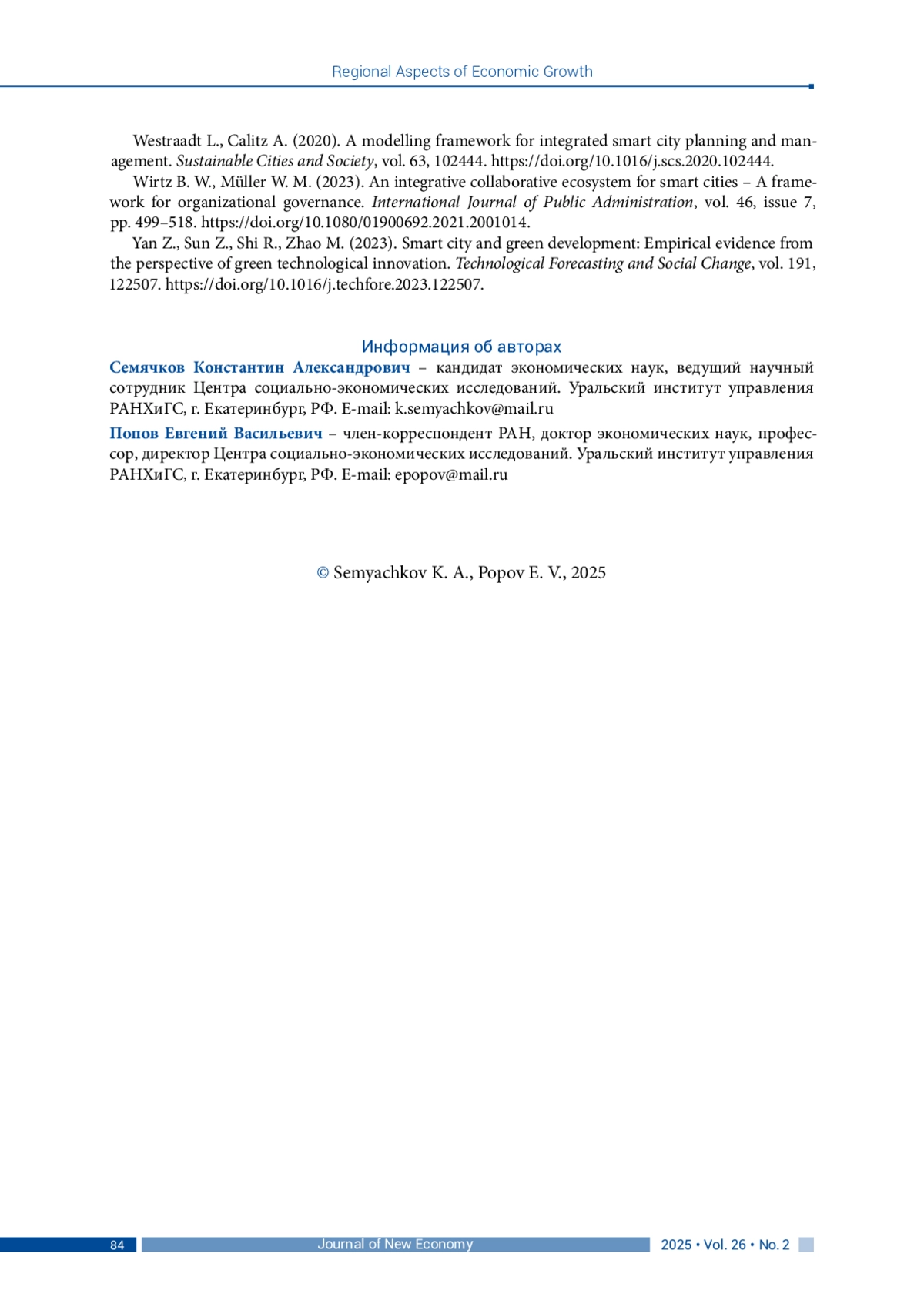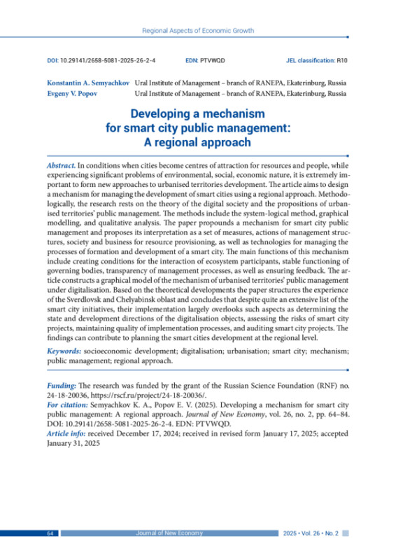 СЕМЯЧКОВ К. А., ПОПОВ Е. В. DEVELOPING A MECHANISM FOR SMART CITY PUBLIC MANAGEMENT: A REGIONAL APPROACH // JOURNAL OF NEW ECONOMY. 2025. Т. 26 № 2