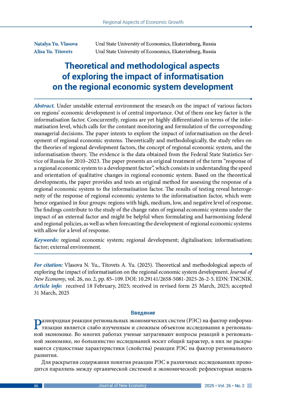 В условиях нестабильности внешней среды особую значимость приобретает исследование воздействия различных факторов на экономическое развитие регионов, среди которых одним из ключевых становится фактор информатизации. При этом продолжает сохраняться региональная дифференциация по уровню информатизации, что требует постоянного мониторинга и выработки соответствующих управленческих решений. Статья посвящена исследованию влияния информатизации на развитие региональной экономической системы. Теоретическую и методологическую основу исследования составили теории факторов регионального развития, концепция региональной экономической системы, теория информатизации. Информационной базой послужили данные Федеральной службы государственной статистики за 2010–2023 гг. Предложена авторская трактовка понятия «реакция региональной экономической системы на фактор развития», которая заключается в понимании скорости и направленности качественных изменений региональной экономической системы. Представлен и апробирован авторский методический подход к оценке реакции региональной экономической системы на фактор информатизации. Выявлена неоднородность реакции региональных экономических систем на фактор информатизации, которые были сгруппированы на четыре типа: регионы с высоким, со средним, с низким и с отрицательным уровнем реакции. Результаты исследования вносят вклад в изучение темпов изменения региональных экономических систем под воздействием внешнего фактора развития и могут быть использованы при разработке и гармонизации федеральной и региональной политик, а также при прогнозировании развития региональных экономических систем с учетом степени реакции