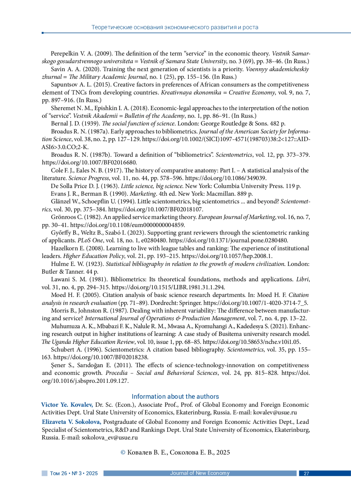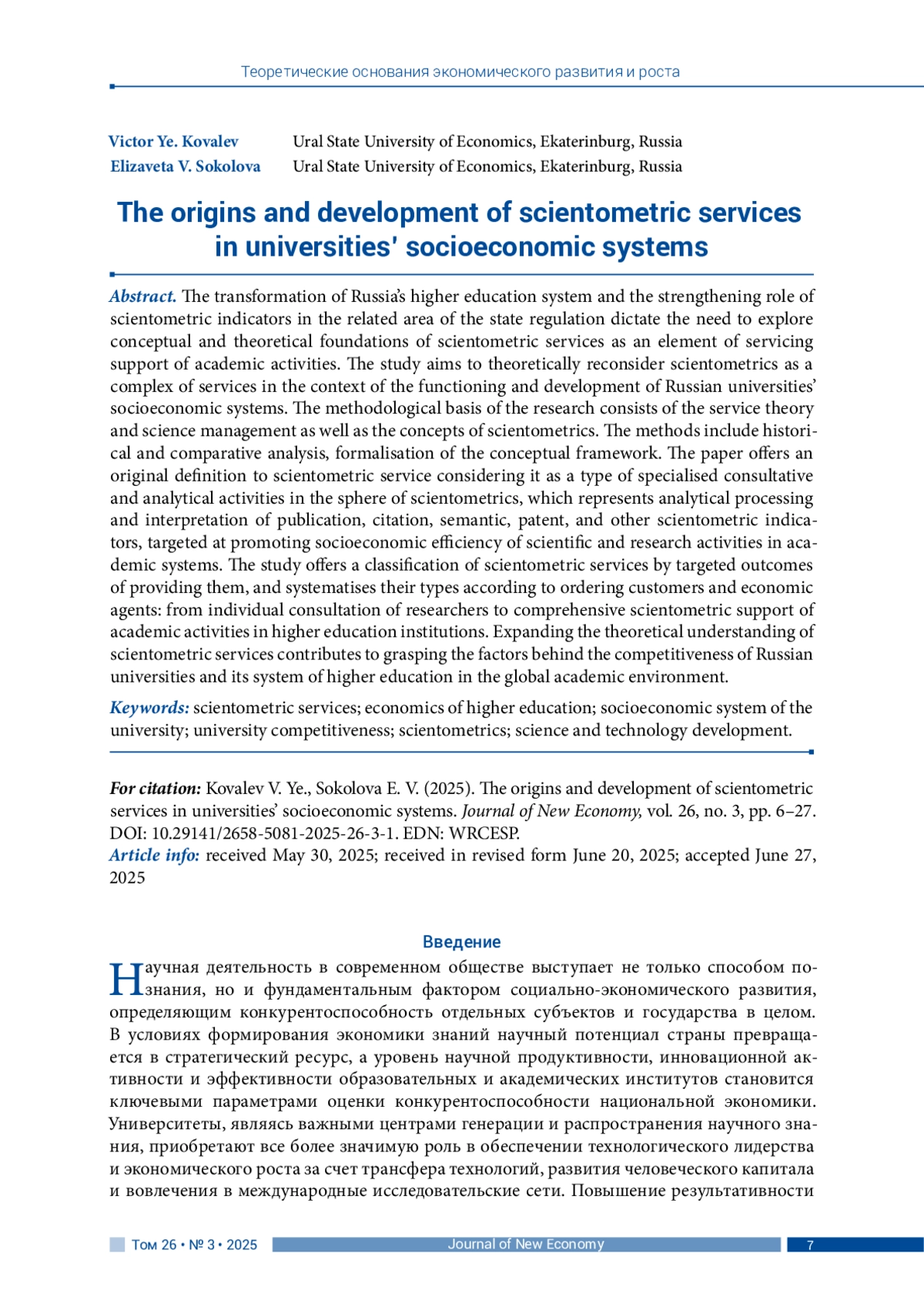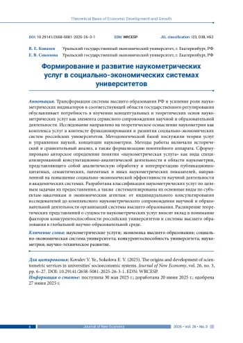 КОВАЛЕВ В. Е., СОКОЛОВА Е. В. ФОРМИРОВАНИЕ И РАЗВИТИЕ НАУКОМЕТРИЧЕСКИХ УСЛУГ В СОЦИАЛЬНО-ЭКОНОМИЧЕСКИХ СИСТЕМАХ УНИВЕРСИТЕТОВ // JOURNAL OF NEW ECONOMY. 2025. Т. 26 № 3