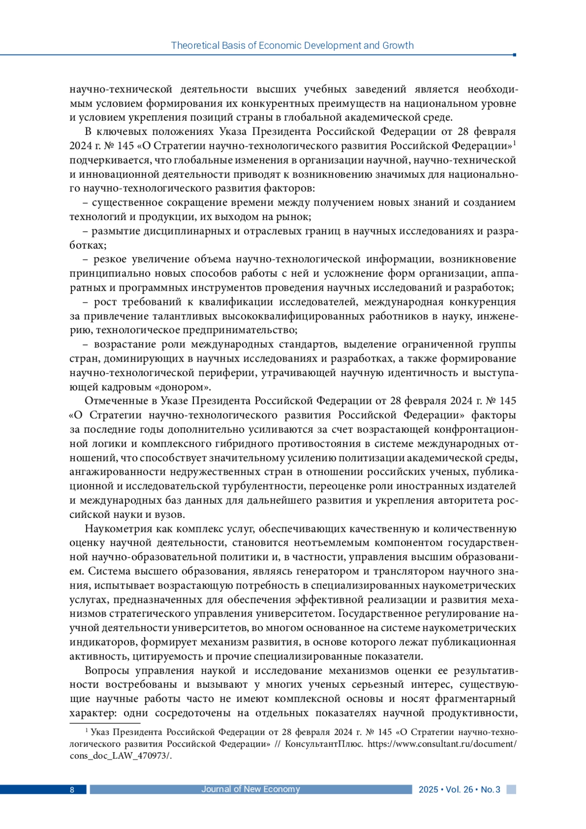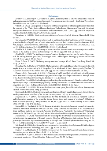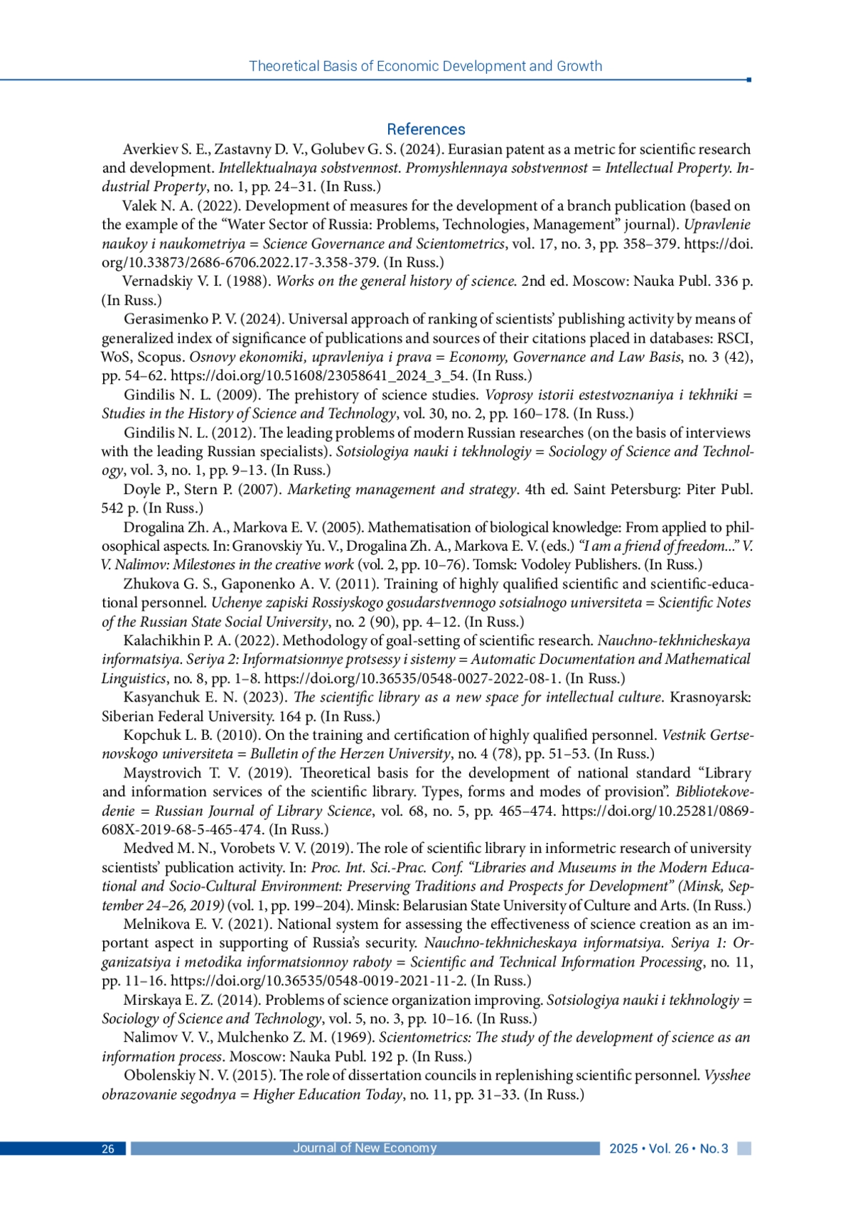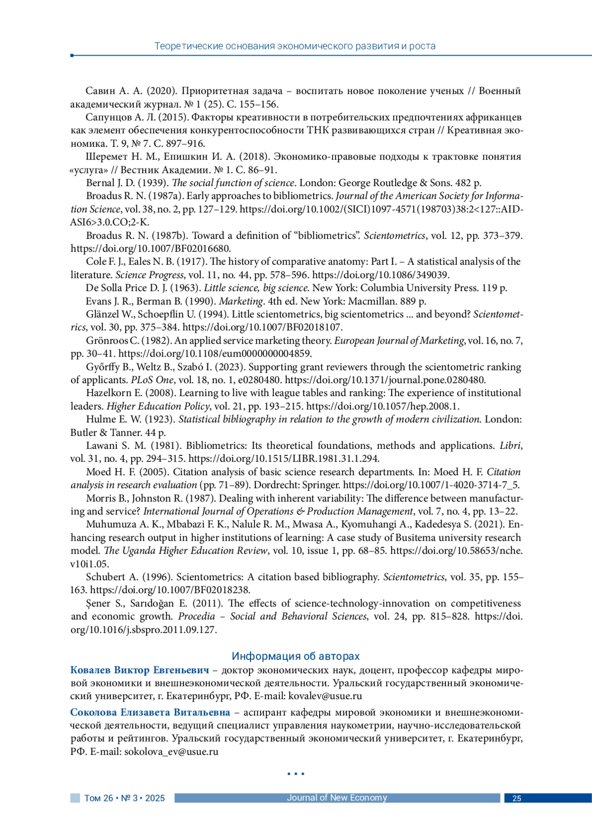 КОВАЛЕВ В. Е., СОКОЛОВА Е. В. ФОРМИРОВАНИЕ И РАЗВИТИЕ НАУКОМЕТРИЧЕСКИХ УСЛУГ В СОЦИАЛЬНО-ЭКОНОМИЧЕСКИХ СИСТЕМАХ УНИВЕРСИТЕТОВ // JOURNAL OF NEW ECONOMY. 2025. Т. 26 № 3