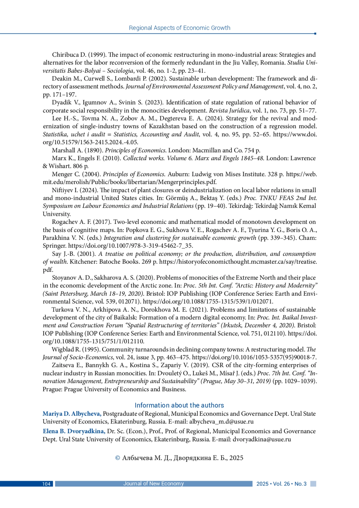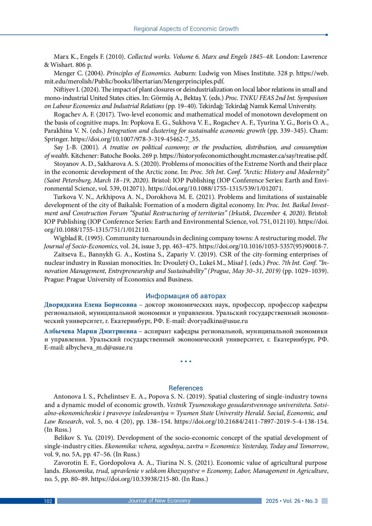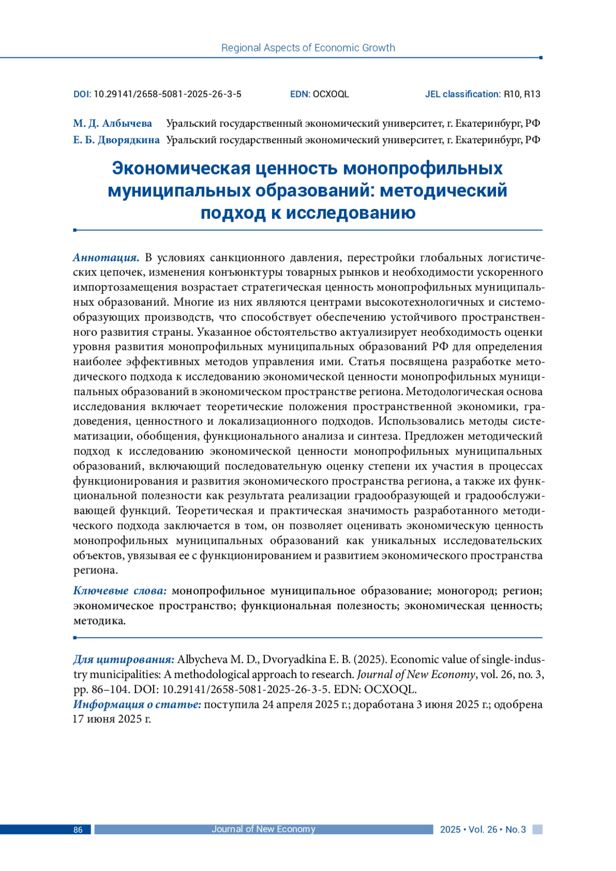 АЛБЫЧЕВА М. Д., ДВОРЯДКИНА Е. Б. ЭКОНОМИЧЕСКАЯ ЦЕННОСТЬ МОНОПРОФИЛЬНЫХ МУНИЦИПАЛЬНЫХ ОБРАЗОВАНИЙ: МЕТОДИЧЕСКИЙ ПОДХОД К ИССЛЕДОВАНИЮ // JOURNAL OF NEW ECONOMY. 2025. Т. 26 № 3