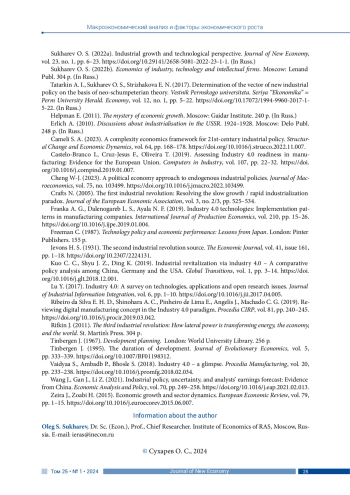 11. Сухарев О. С. (2022a). Промышленный рост и технологическая перспектива // Journal of New Economy. Т. 23, № 1. С. 6-23. DOI: 10.29141/2658-5081-2022-23-1-1 EDN: RNGFTG