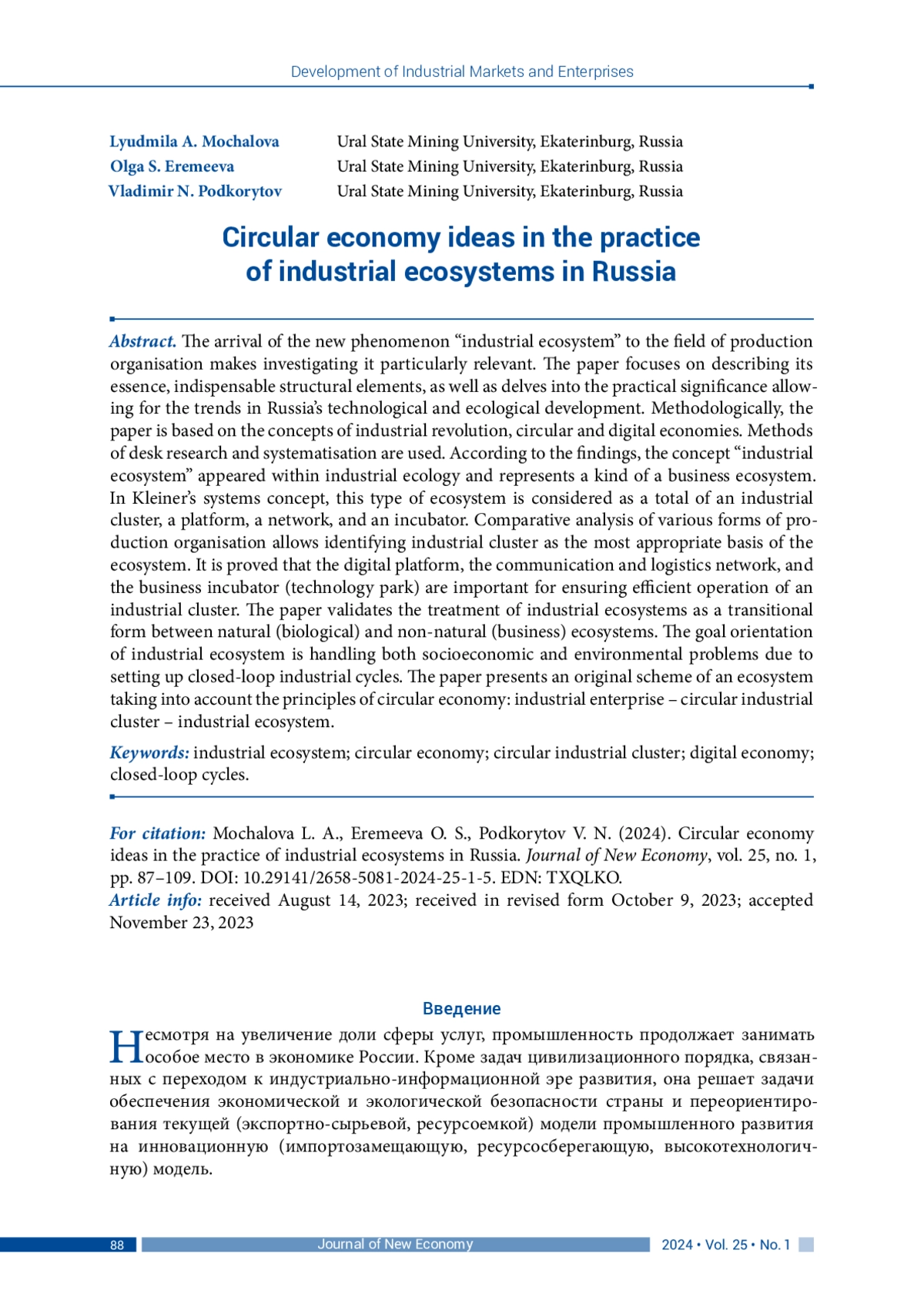 Возникновение нового феномена «промышленная экосистема» в сфере организации производства актуализирует необходимость его изучения. Статья посвящена описанию его сущности, обязательных структурных элементов, а также практической значимости с учетом тенденций технологического и экологического развития России. Методологической основой выступили концепции промышленной революции, циркулярной и цифровой экономики. Использовались методы кабинетного исследования и систематизации. Выявлено, что понятие «промышленная экосистема» возникло в рамках концепции промышленной экологии и рассматривается как разновидность экосистем бизнеса. Изучена системная концепция Г. Б. Клейнера, которая рассматривает данный тип экосистем как совокупность промышленного кластера, платформы, сети и инкубатора. Сравнительный анализ различных форм организации производства позволяет выделить промышленный кластер в качестве более подходящей основы экосистемы. Доказана важность цифровой платформы, коммуникационно-логистической сети и бизнес-инкубатора (технопарка) с точки зрения обеспечения эффективного функционирования промышленного кластера. Обосновано, что промышленные экосистемы могут рассматриваться в качестве промежуточной формы между природными (биологическими) и неприродными (бизнес-) экосистемами. Определена целевая ориентация промышленной экосистемы на решение одновременно социально-экономических и экологических проблем с помощью организации замкнутых промышленных циклов. Разработана схема экосистемы с учетом принципов циркулярной экономики: промышленное предприятие – циркулярный промышленный кластер – промышленная экосистема